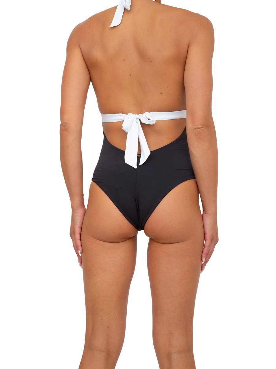 Costume intero con scollatura davanti e sul retro realizzato in jersey, ultra leggero, resistente al pilling e con fattore di protezione UPF 50+, che dona a chi lo indossa una piacevole sensazione di comfort su tutto il corpo. La fascia sotto al seno si allunga e diventa un laccio di chiusura sul retro.