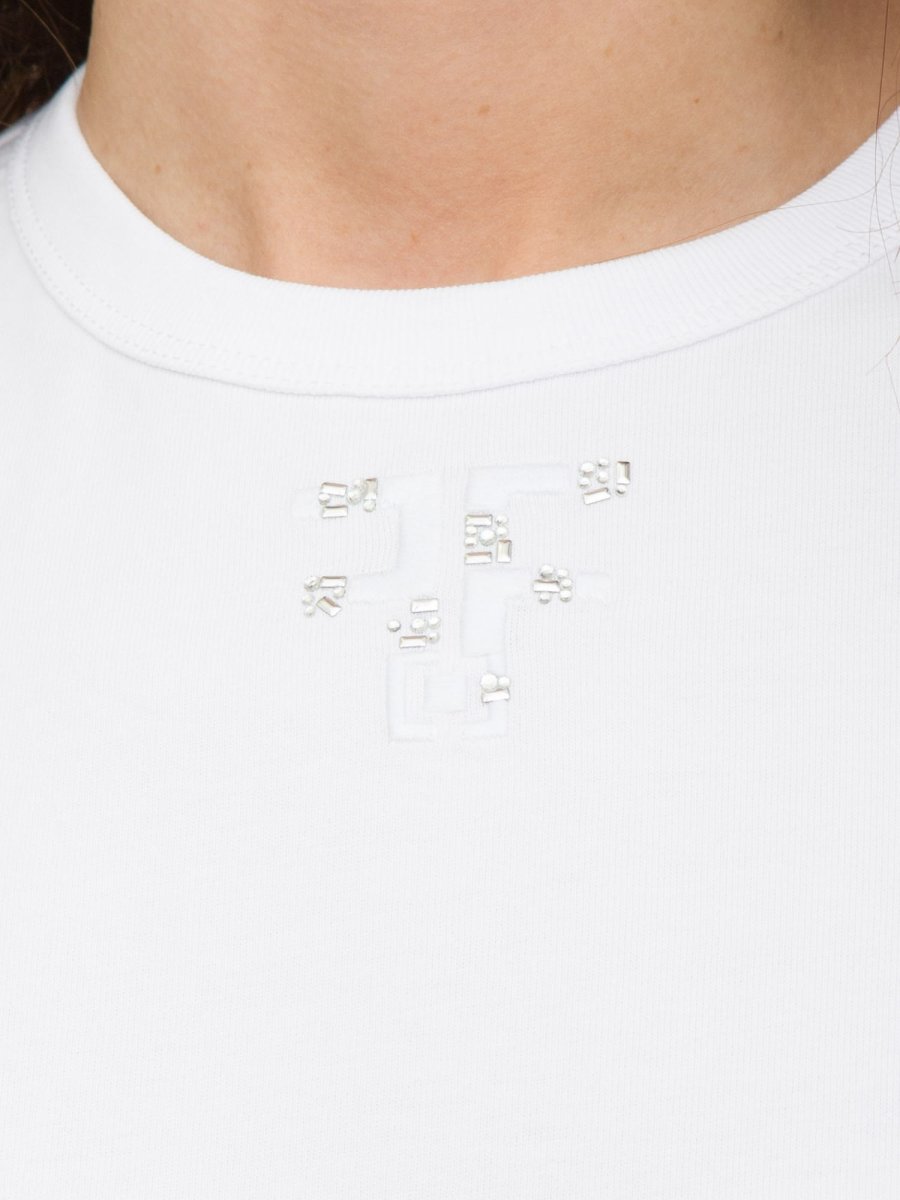 Женская футболка Fracomina, модель с V-образным вырезом и короткими рукавами. Дизайн с логотипом из стразов спереди и классический крой позволяют носить его с различными повседневными образами.