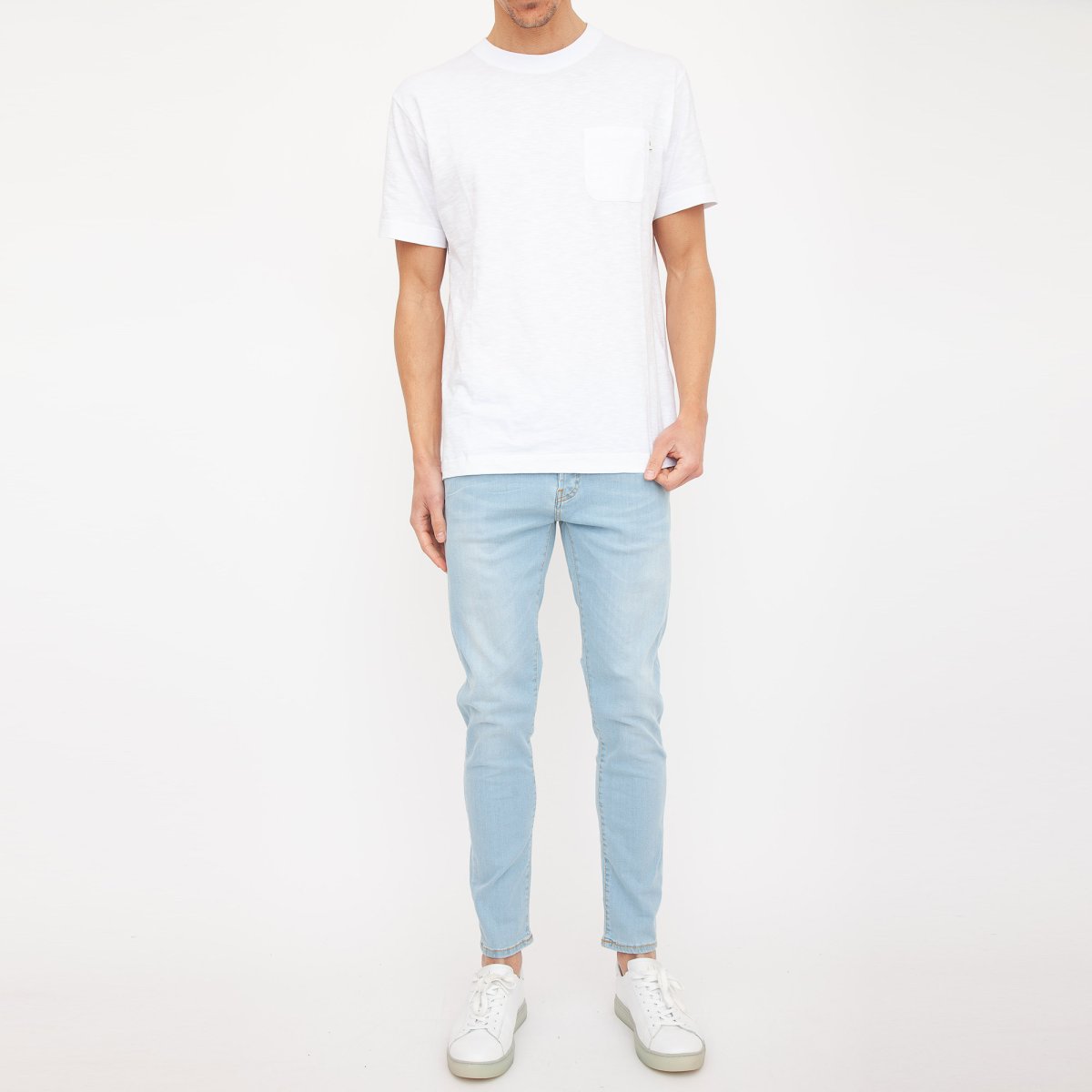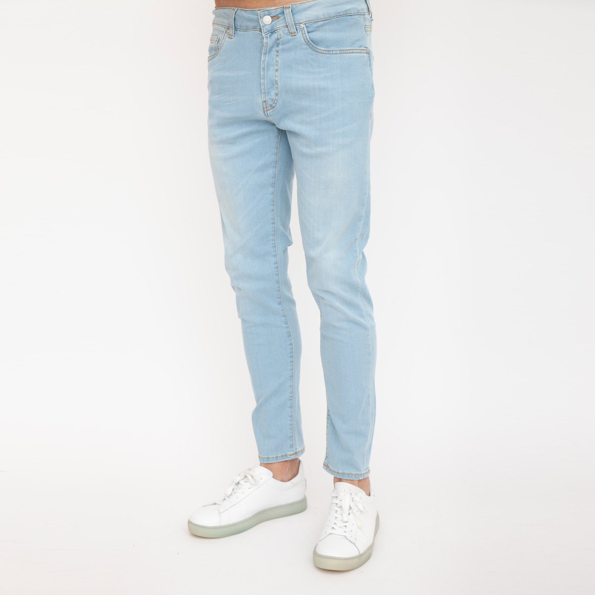 Jeans Liu-jo uomo in denim stretch, vestibilità twisted, modello cinque tasche, lavaggio stonewash chiaro, cuciture a contrasto, salpa in pelle con logo e chiusura con bottoni logati.