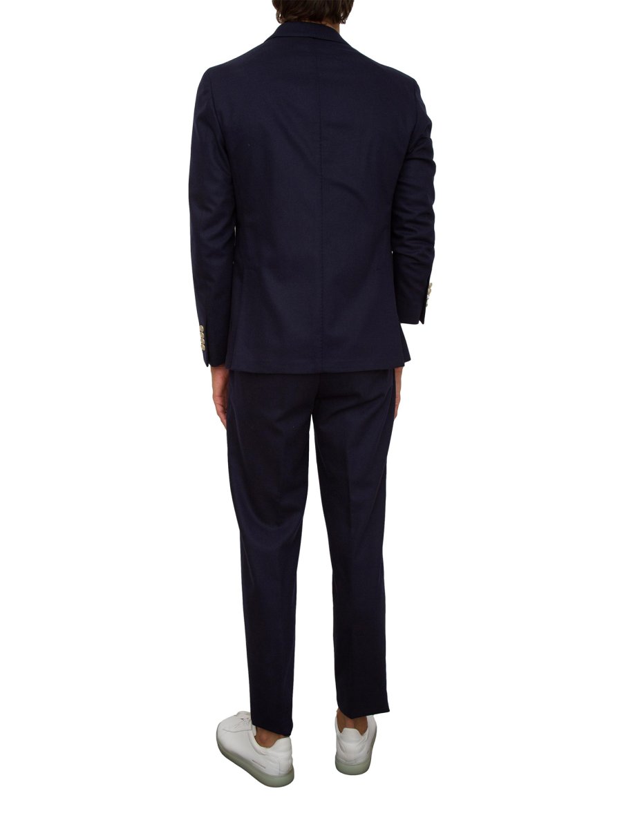 Двубортный костюм и брюки с двумя складками из смеси эластичной фланели и кашемира. Резинка на бедрах, увеличивает комфорт, а наличие двух складок обеспечивает слегка мягкую посадку на бедрах. Роговые пуговицы дополняют и украшают костюм.