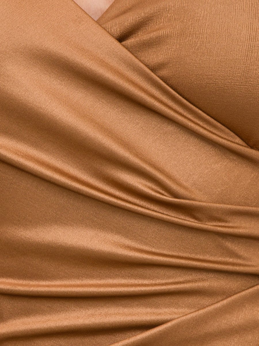 Abito senza maniche lungo in tessuto lucido, scollo ad incrocio, e con spacco sul davanti.
