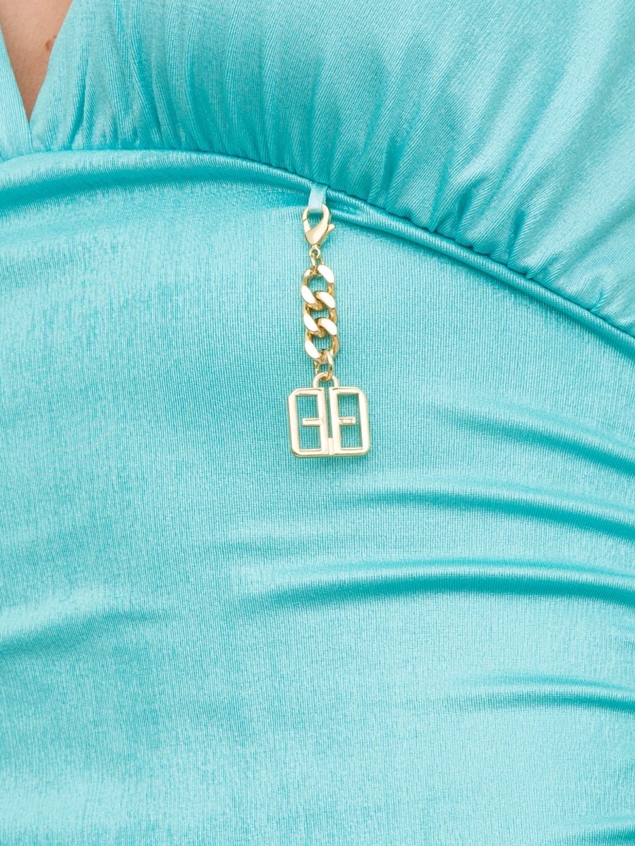 Abito slim mini in tessuto lucido, scollo a V, e senza maniche.