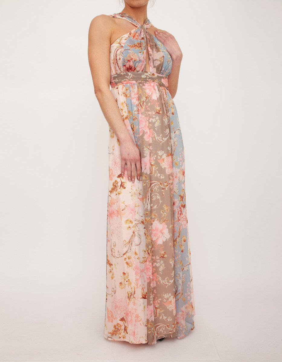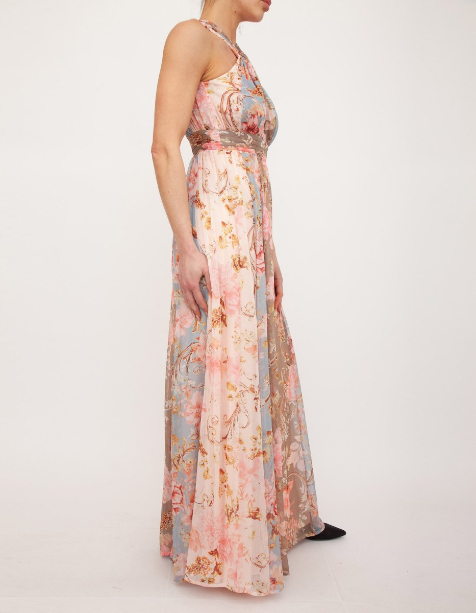 Vestito da cerimonia ecosostenibile in creponne, stampa patchwork floreale all over, scollatura off the shoulder con nodo incrociato e cintone elastico in vita. Prodotto sostenibile “Liu Jo Better”.