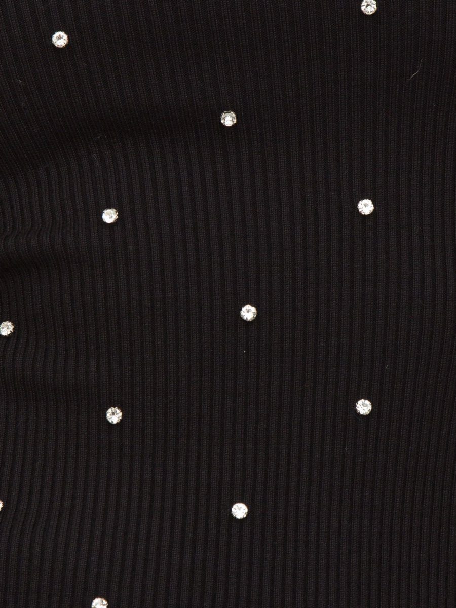 Vestito corto da donna Liu-Jo realizzato in misto viscosa, lavorazione a costine, applicazione di strass, scollatura quadrata e maniche lunghe a palloncino.