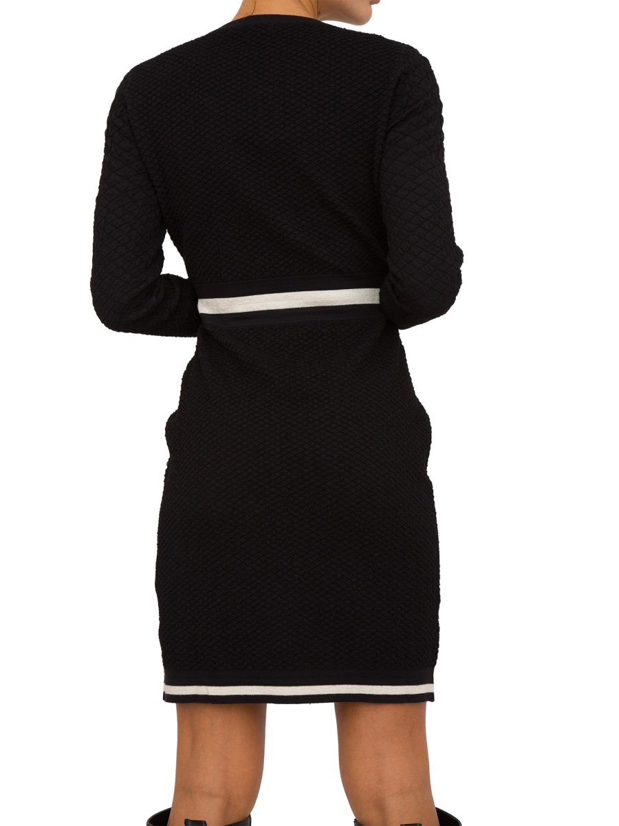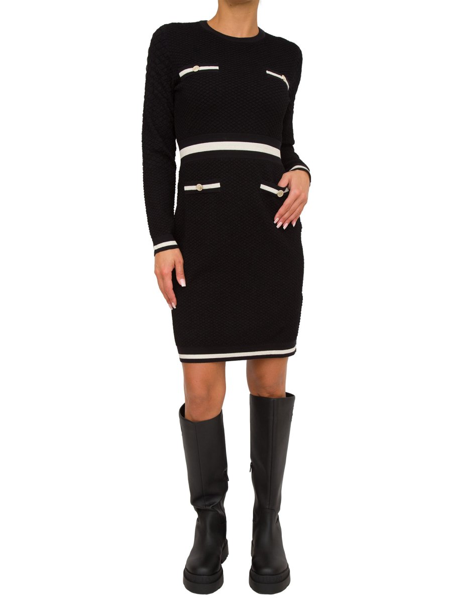 Abito da donna in maglia Liu-Jo realizzato con filati in viscosa stretch, motivo a righe jacquard, scollo rotondo, maniche lunghe, taschini e tasche con bottone logato, elastico in vita e bordi rifiniti a costine.
