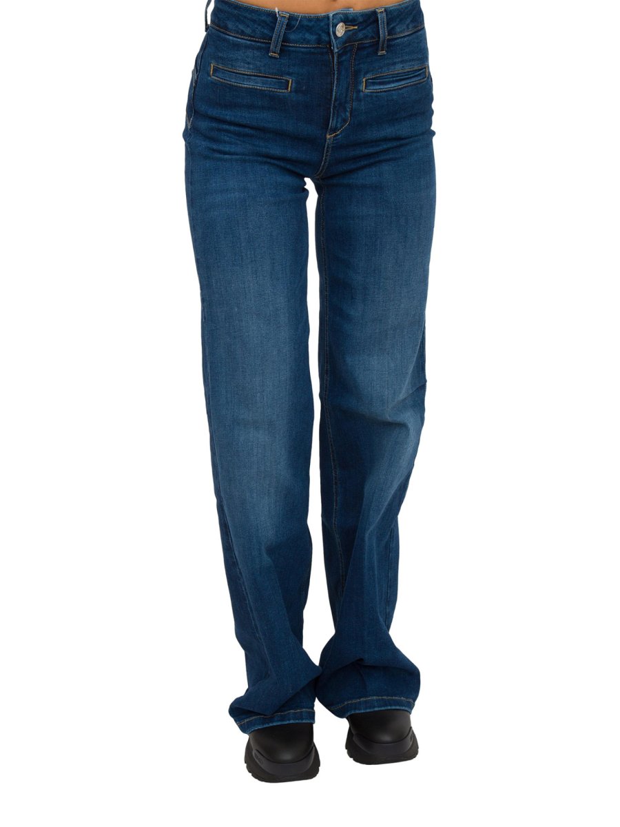 Jeans donna Liu Jo Better realizzati in denim di cotone stretch, lavaggio used, piega stirata, vita alta, tasche a filetto sul davanti e applicate sul retro, gamba flare, chiusura con zip nascosta e bottone, elastico in vita sul retro e logo sul retro.