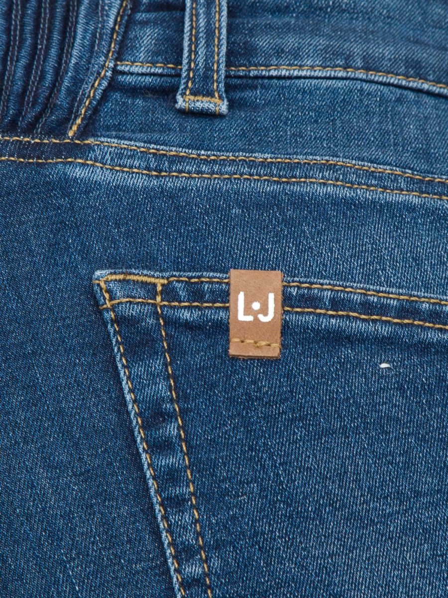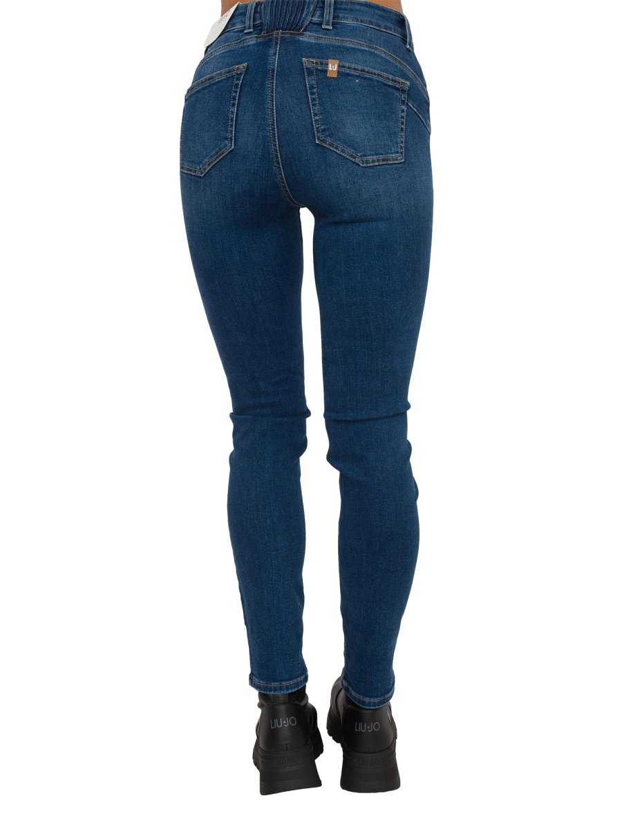 Jeans donna ecosostenibili Liu-Jo realizzati in denim di cotone stretch, lavaggio used, vita regolare, tagli bottom up, modello cinque tasche, gamba skinny, chiusura con zip nascosta e bottone, elastico in vita sul retro e logo sul retro.