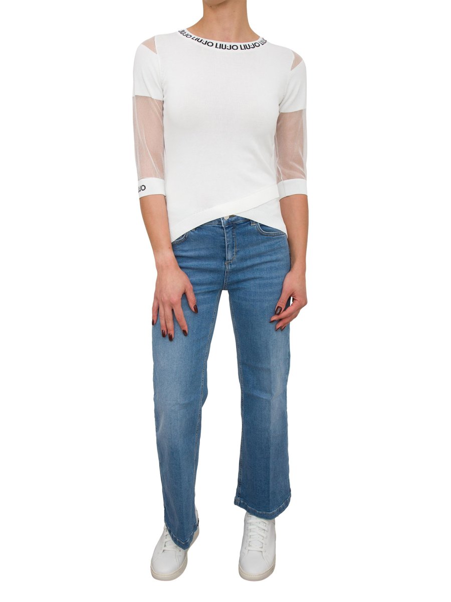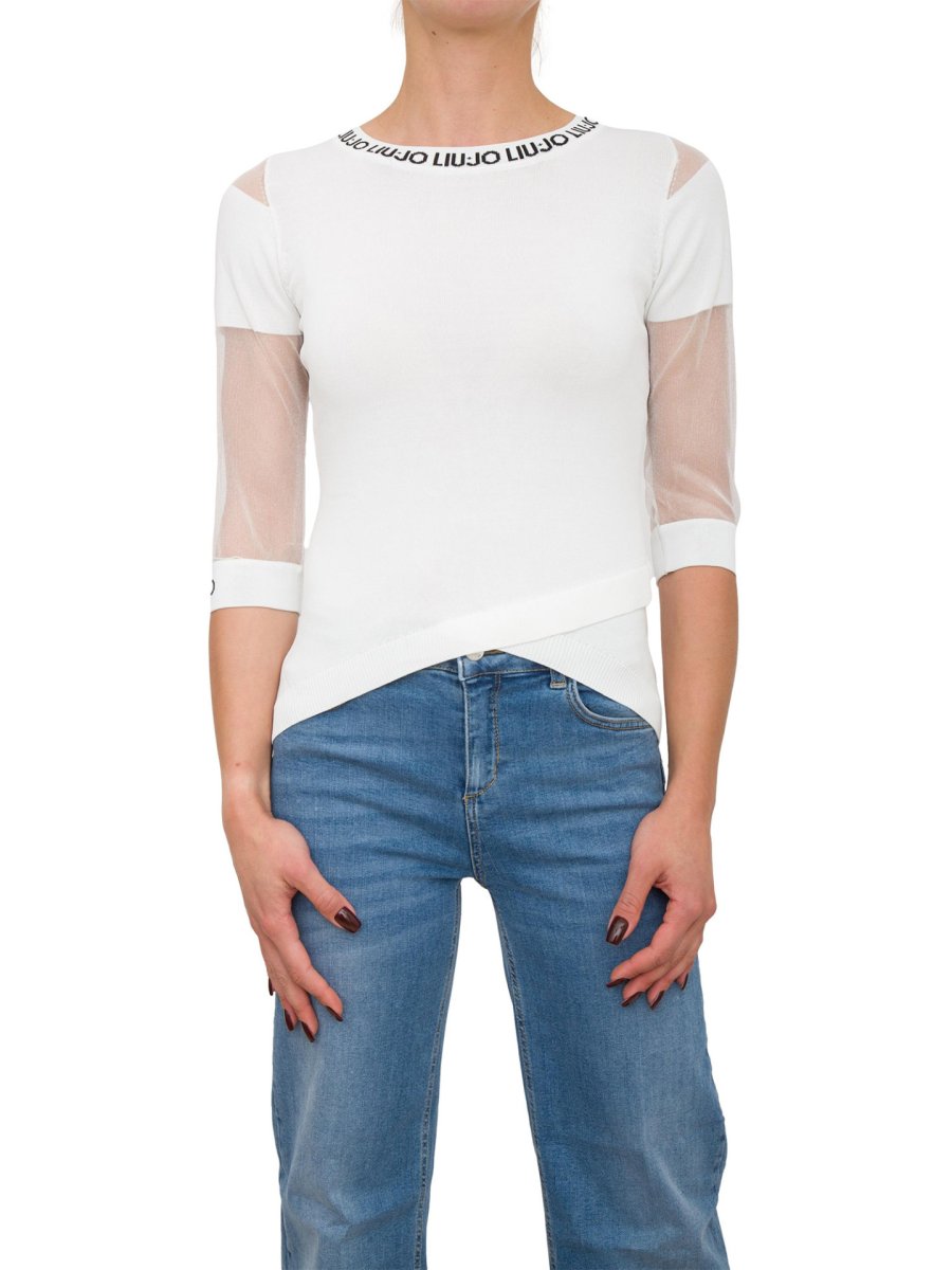 Maglia in misto viscosa Liu-Jo con maniche in rete, scollo rotondo con logo jacquard e maniche a 3/4 in mesh.