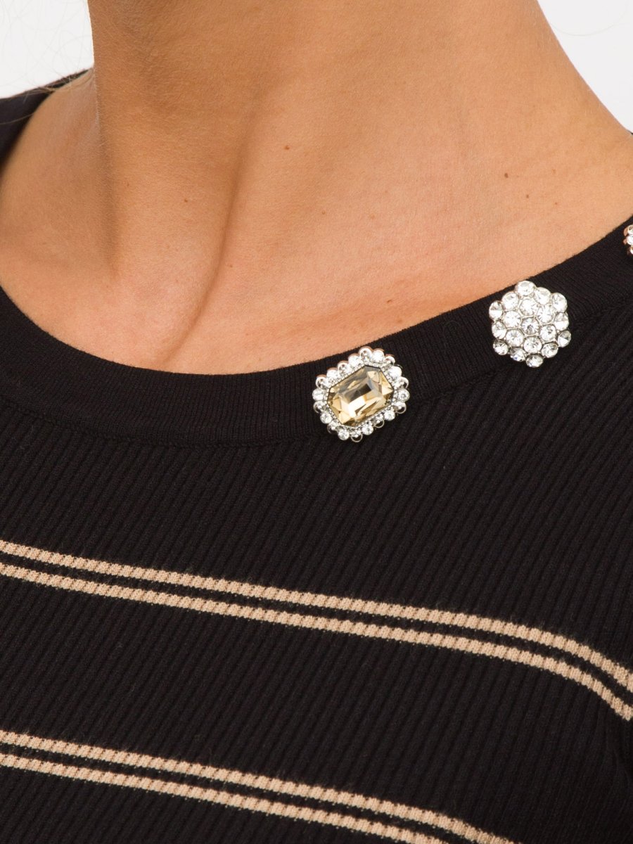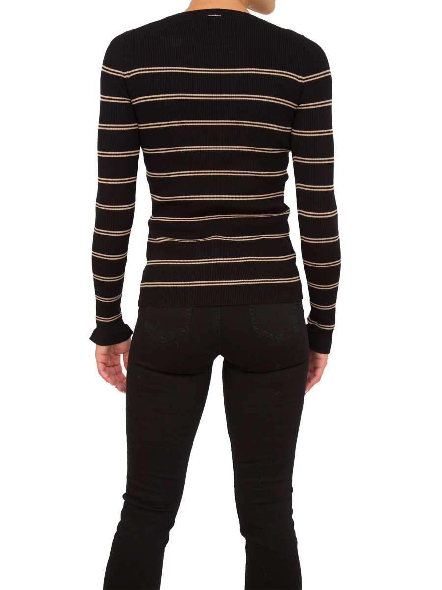 Maglia a righe da donna Liu-Jo realizzata in misto viscosa, lavorazione a costine, motivo a righe, strass applicati, taglio girocollo, maniche lunghe e logo in metallo sul retro.