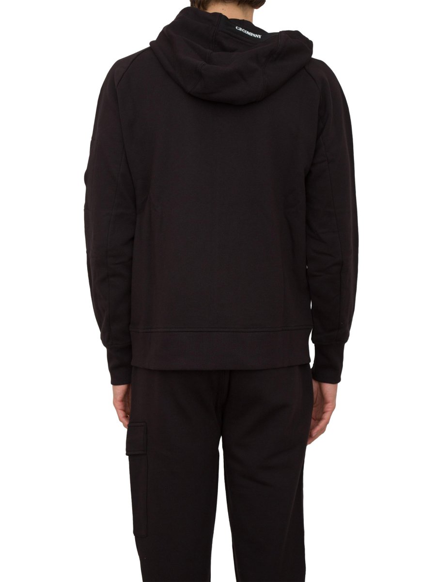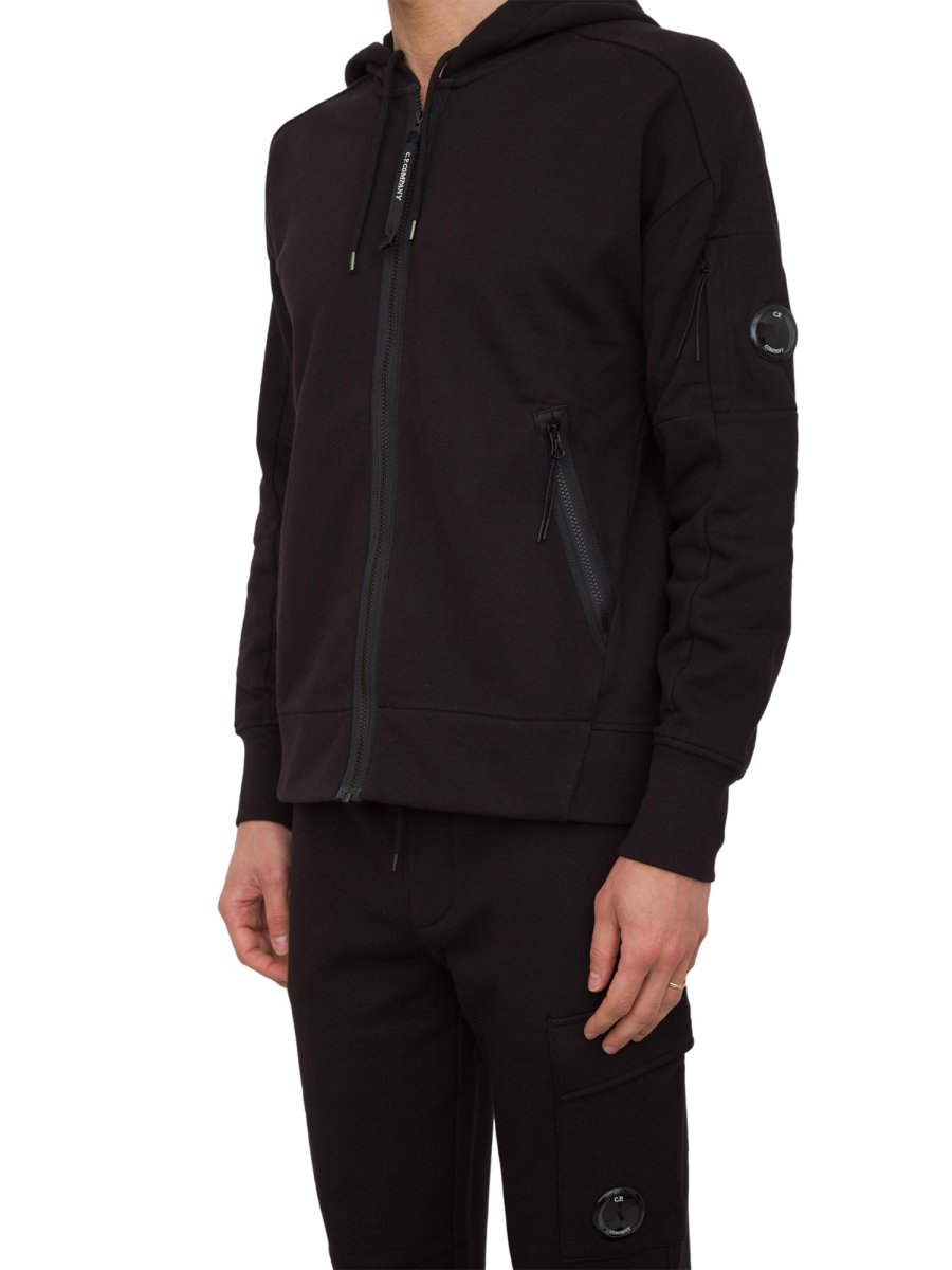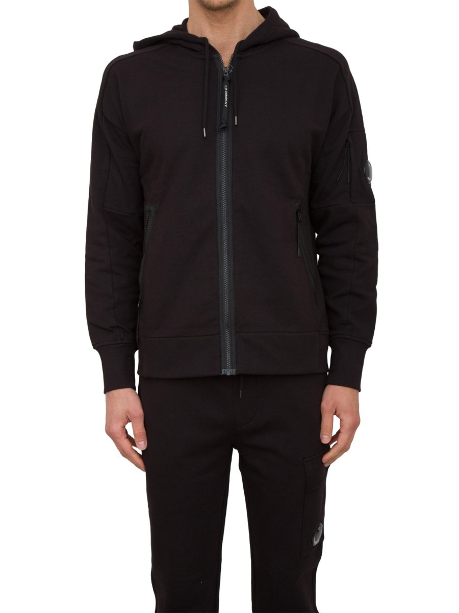 Мужская толстовка C.P. Company с капюшоном и застежкой-молнией, выполненная из хлопкового флиса средней плотности с диагональным переплетением. Модель имеет классический крой, боковые карманы и аппликацию в виде линзы на боковом кармане рукава. Прекрасно сочетается со спортивным костюмом или поверх джинсов и кожаной куртки. Рост модели — 1,90 см, размер одежды — L.