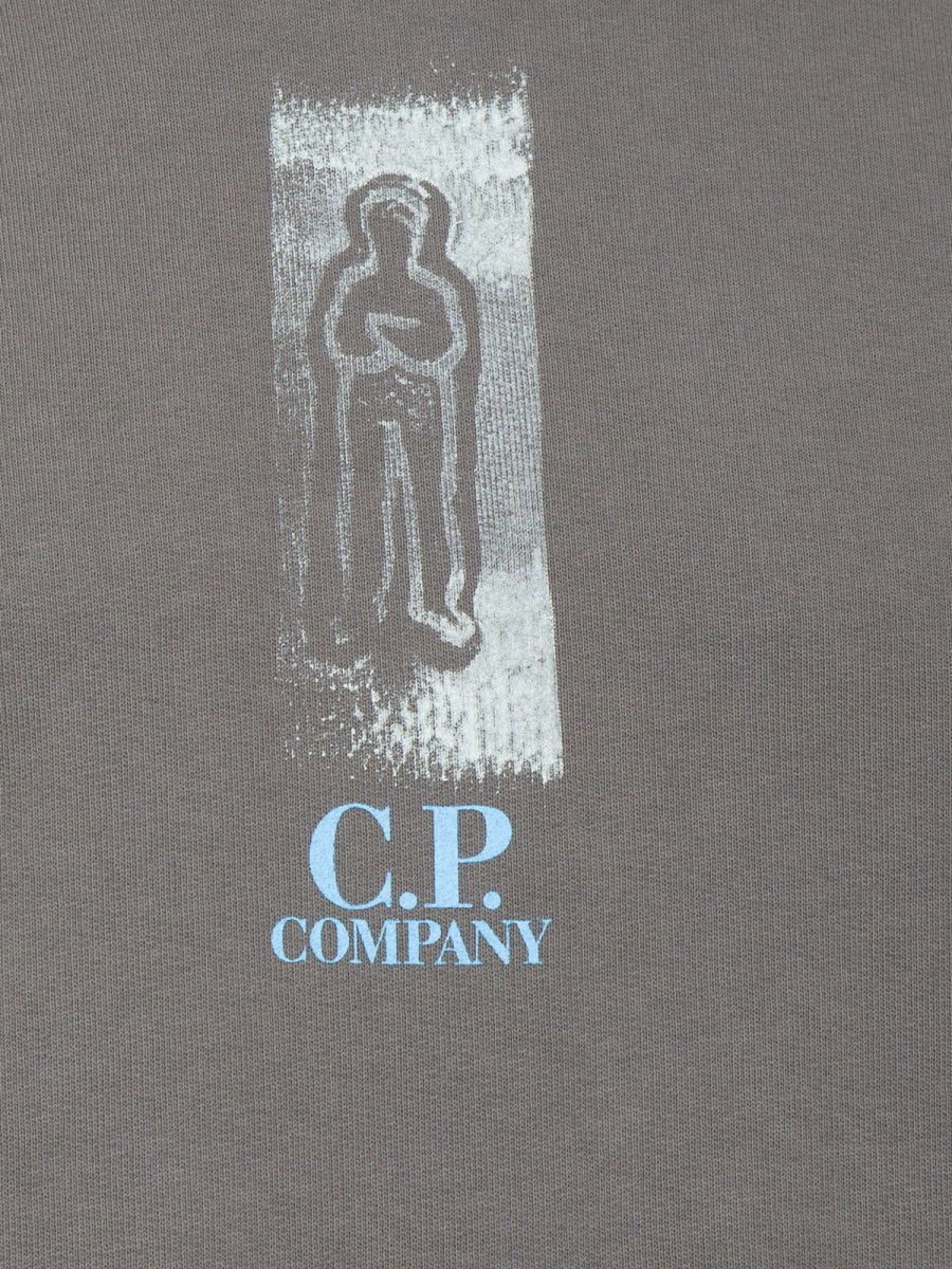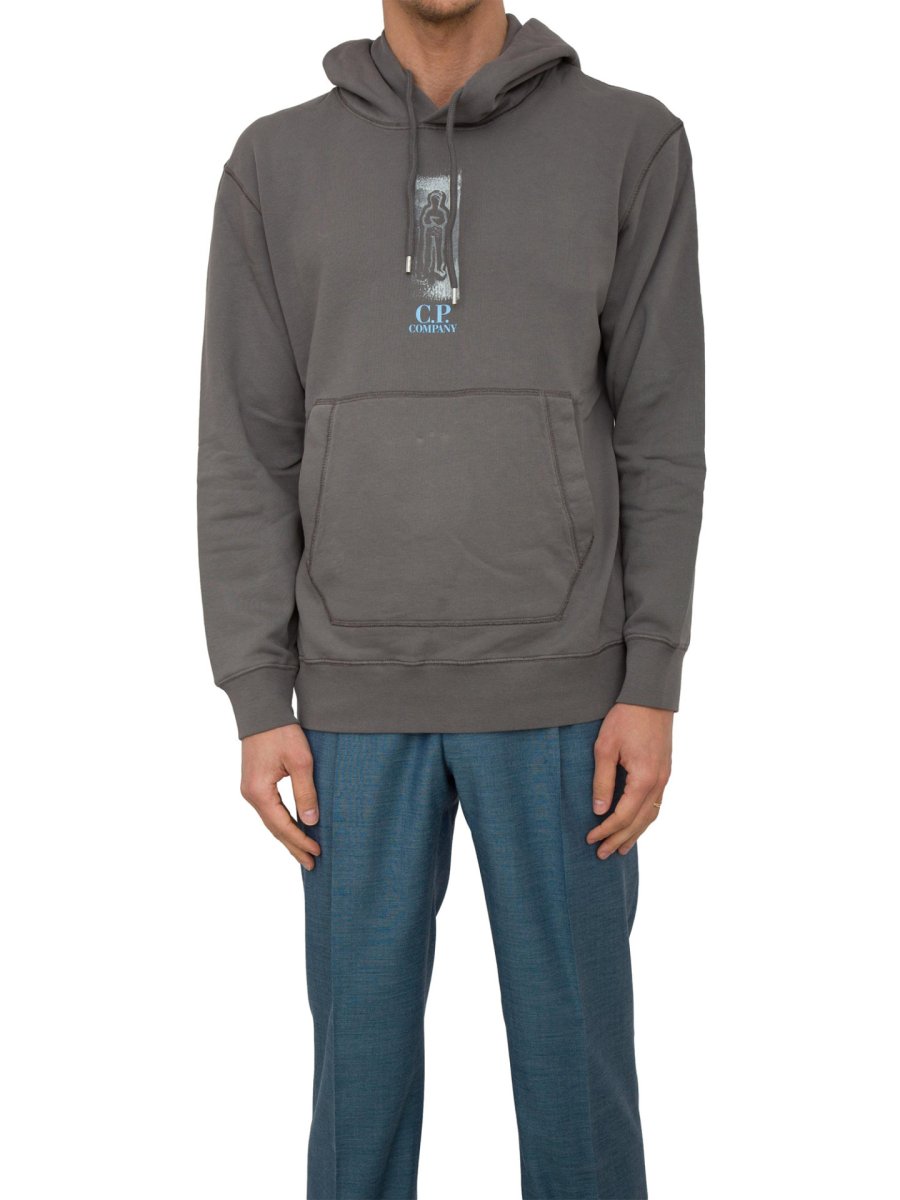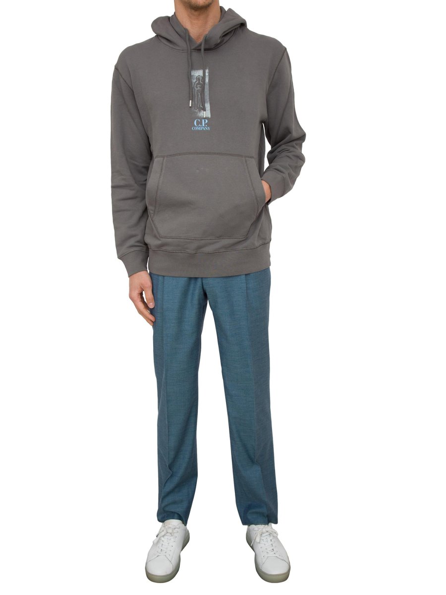 Мужская толстовка от C.P. Company С.П. из хлопкового флиса с регулируемым капюшоном, карманом-кенгуру и логотипом, напечатанным на груди и спине. Изделие имеет классический крой. Два принта придают этой толстовке уникальный стиль, который можно сочетать с разными образами. Рост модели — 1,90 м, размер одежды — L.