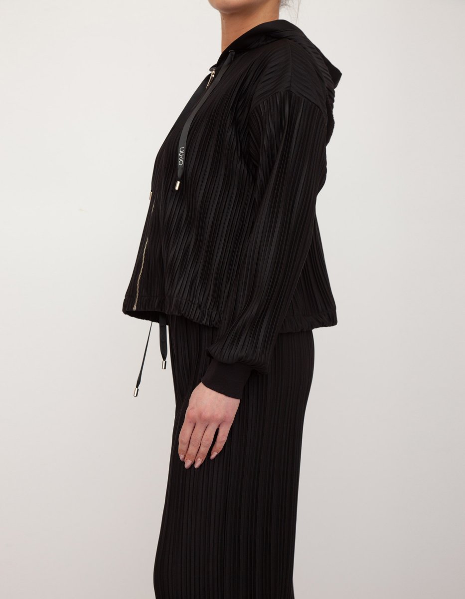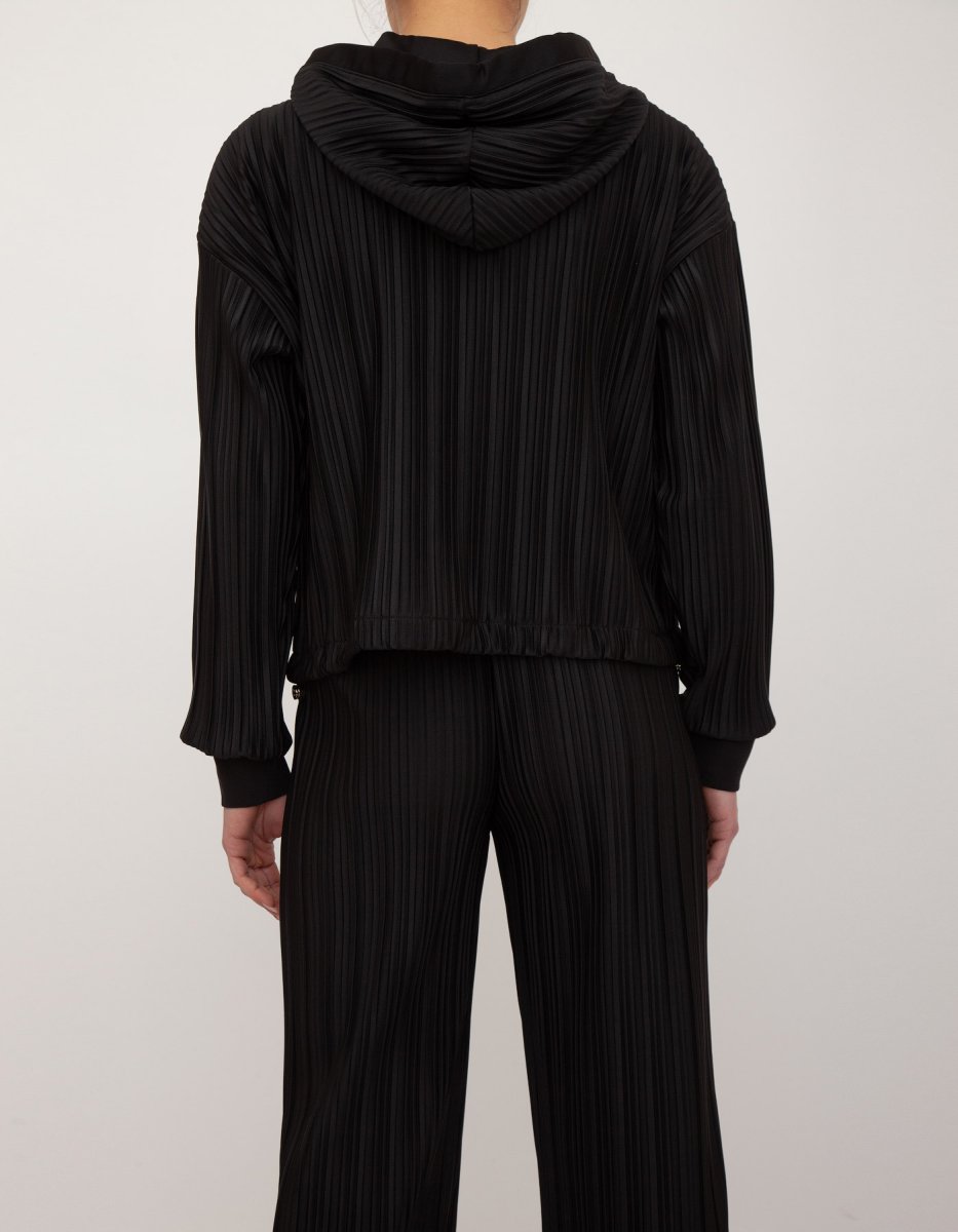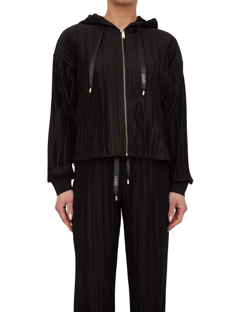 Felpa in jersey stretch, motivo plissé all over, cappuccio con coulisse logata, maniche lunghe a palloncino, polsi con elastico, elastico al fondo e chiusura con zip.