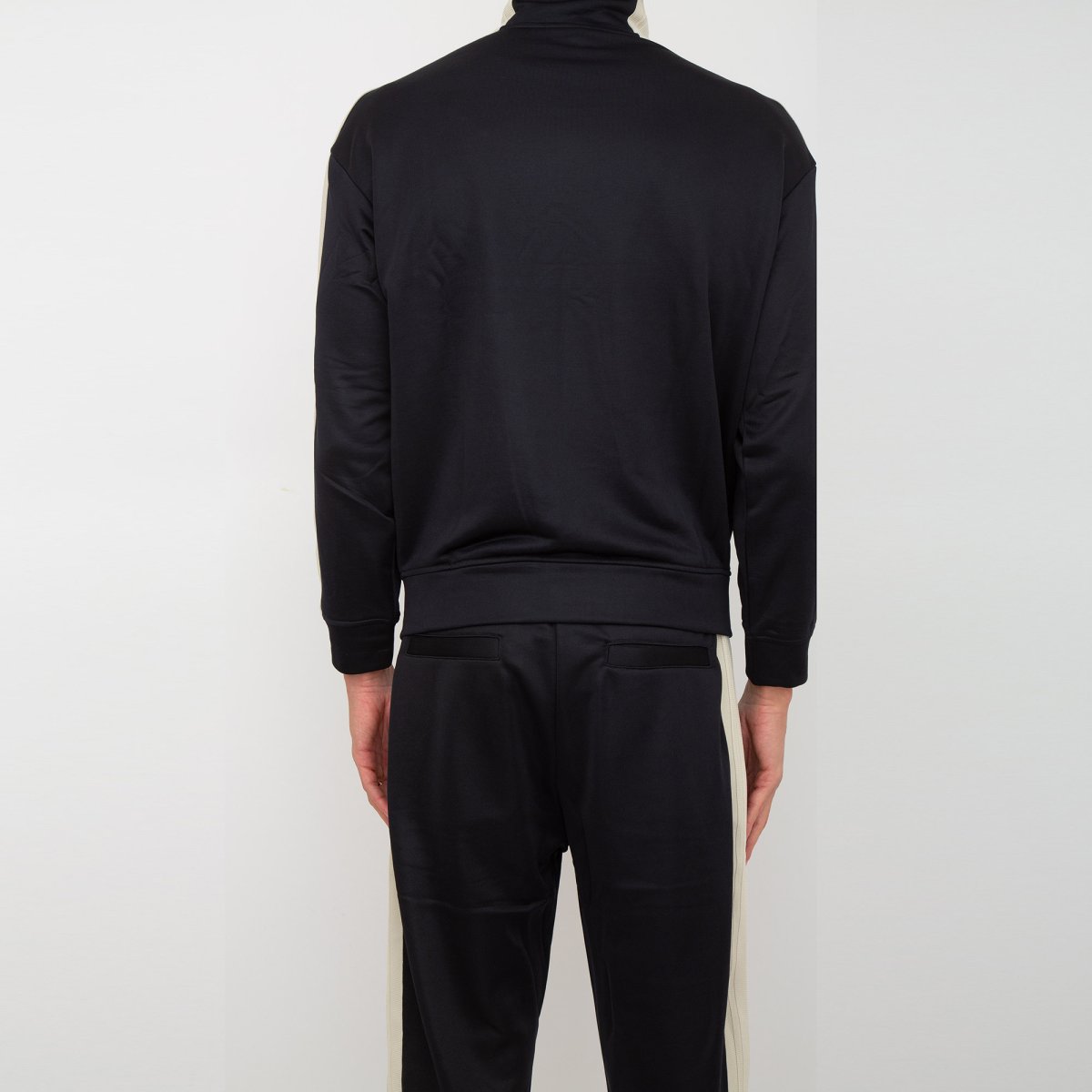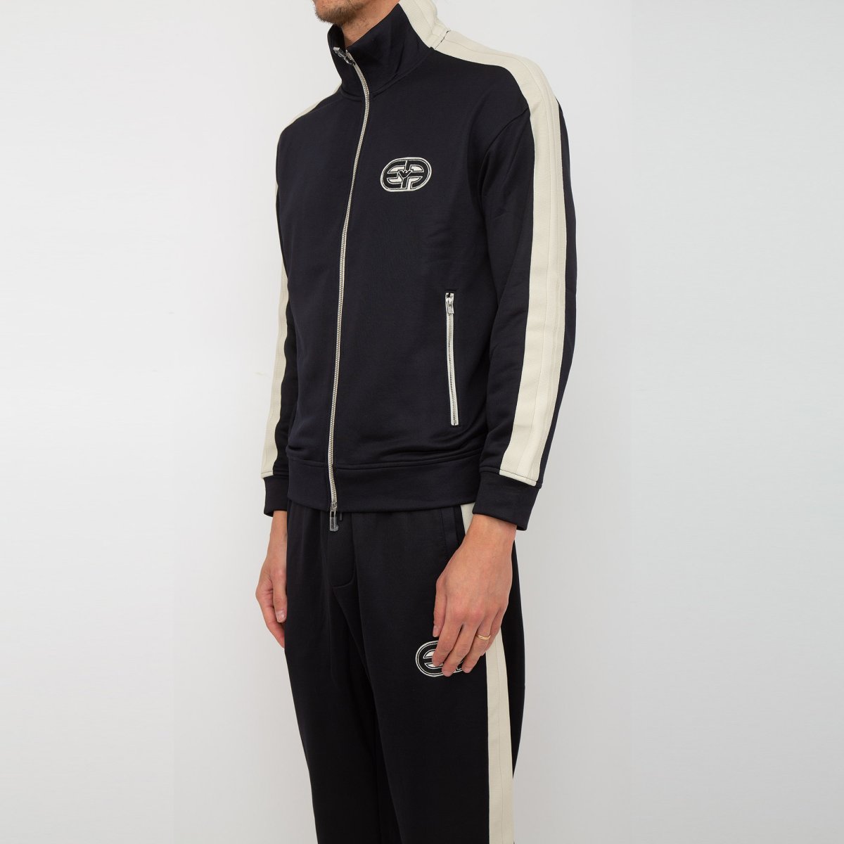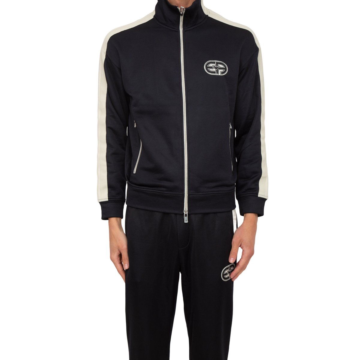 Felpa provvista di chiusura full zip e tasche laterali sempre con zip. Realizzata in jersey misto cotone, si completa di bande a contrasto effetto maglia su maniche e patch logo sagomata sul petto. Fondo e polsini elasticizzati.