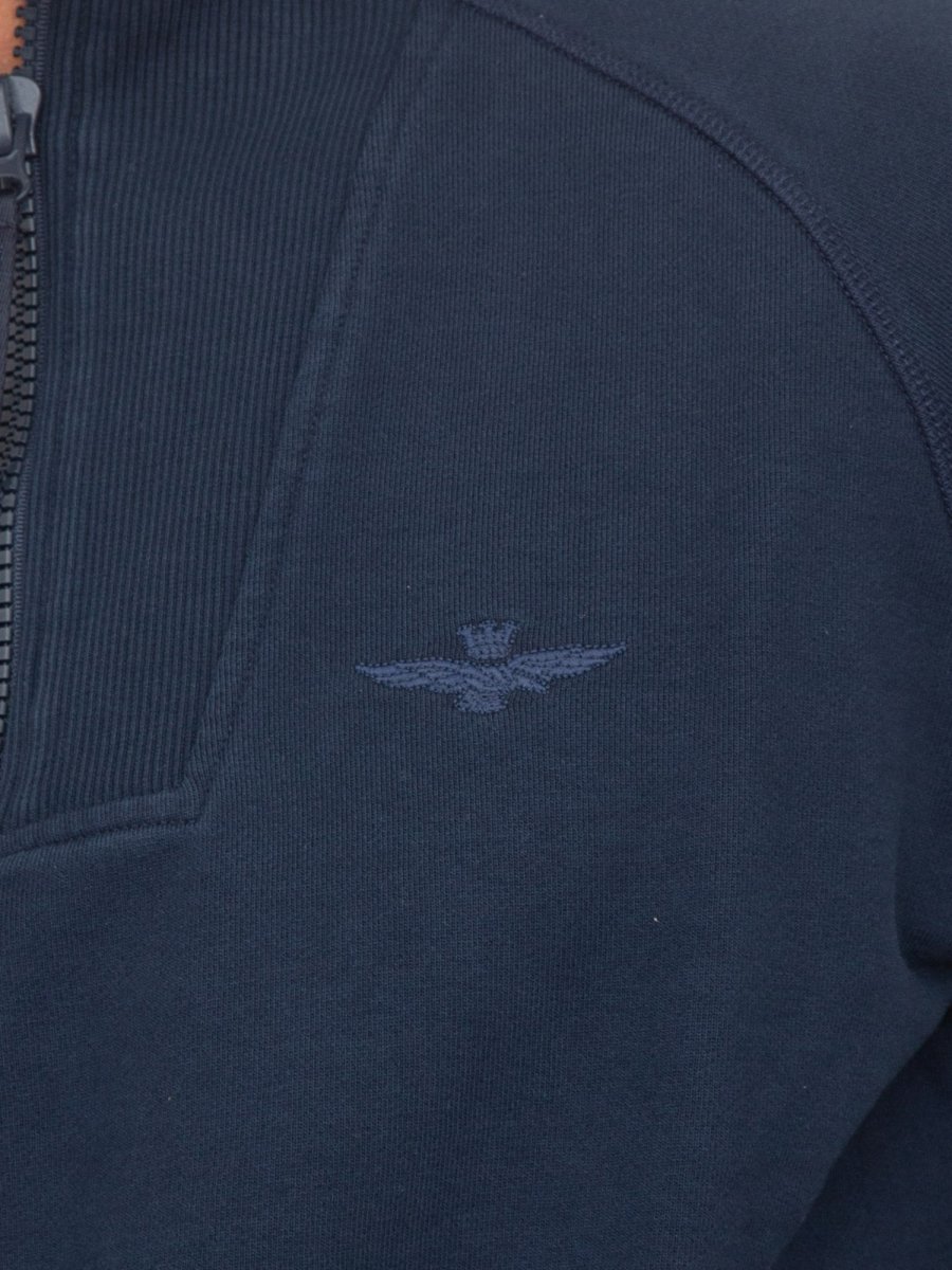 Felpa A.M. in morbido cotone dotata di una chiusura a mezza zip. I dettagli che la impreziosiscono sono discreti, l'iconica aquila turrita sul petto e il patch logo sulla manica sinistra.