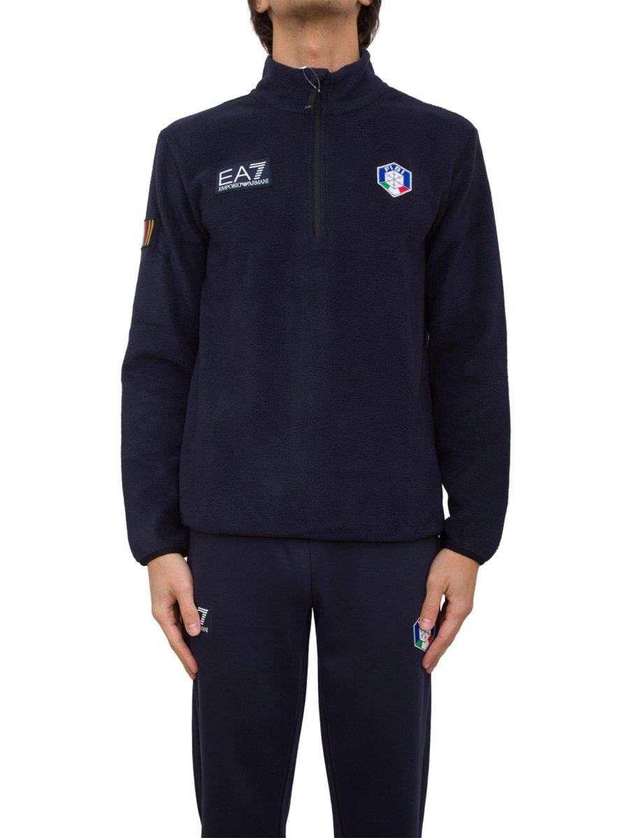 Лыжная куртка EMPORIO ARMANI EA7 из флиса с чистыми и эргономичными линиями, облегчающими передвижение по склонам. Модель с высоким воротом и застежкой-молнией на три четверти дополнена логотипами FISI и EA7 на груди, а также культовым символом семи линий бренда, украшенным итальянским флагом и золотой вставкой.