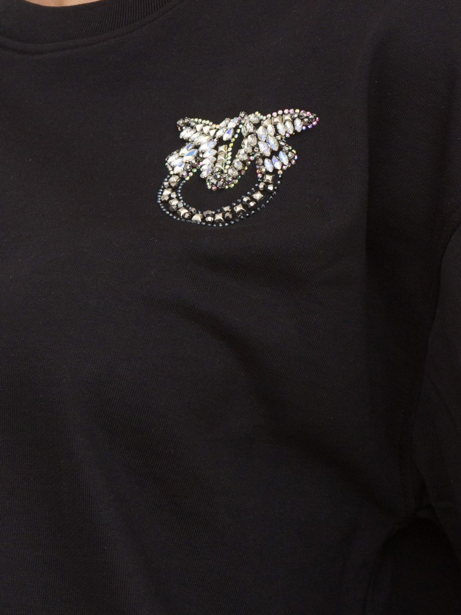 Felpa dal volume boxy in morbido cotone con mini ricamo gioiello Love Birds completato da borchie davanti, lato cuore. Scollo tondo, polsini e fondo capo con elastico. Le maniche lunghe a giro basso sono caratterizzate da volume ampio con arriccio sul retro.