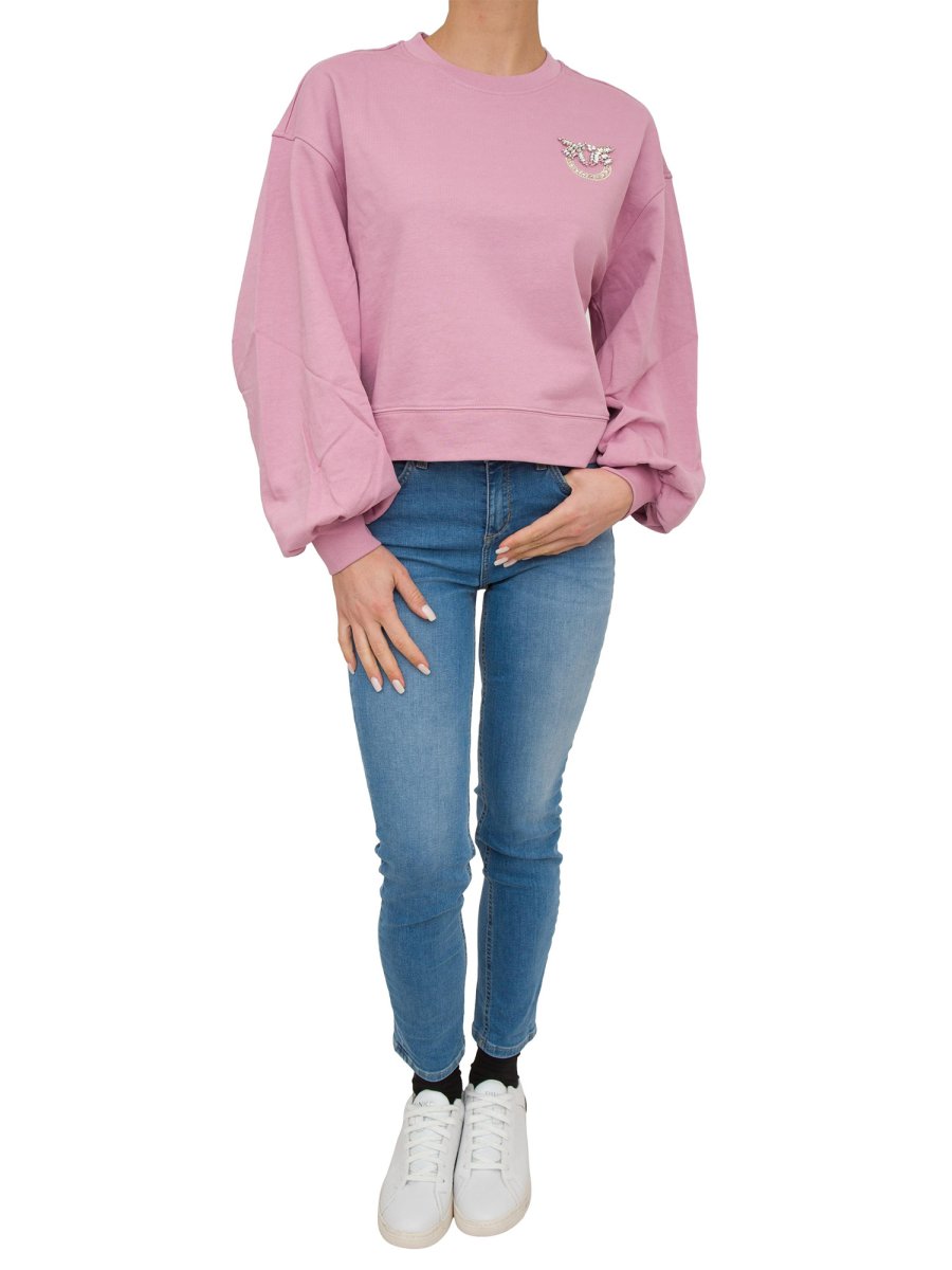 Felpa dal volume boxy in morbido cotone con mini ricamo gioiello Love Birds completato da borchie davanti, lato cuore. Scollo tondo, polsini e fondo capo con elastico. Le maniche lunghe a giro basso sono caratterizzate da volume ampio con arriccio sul retro.