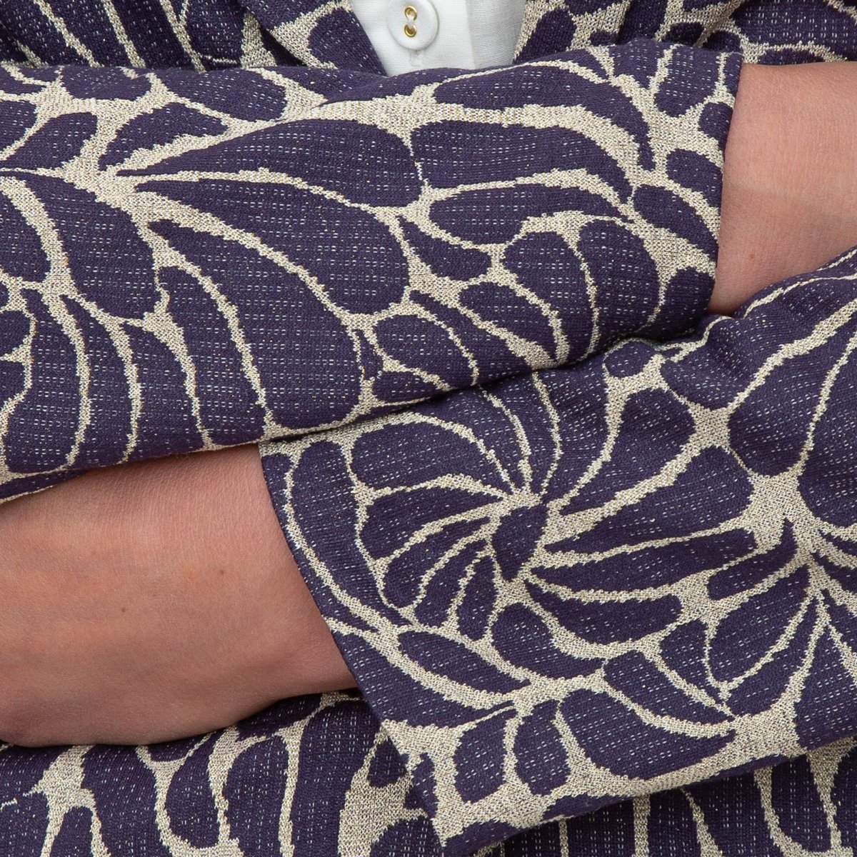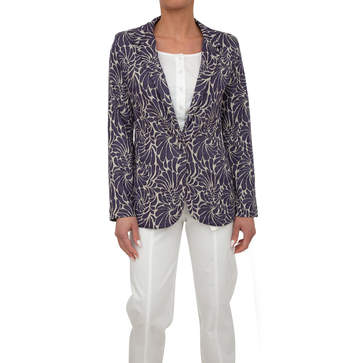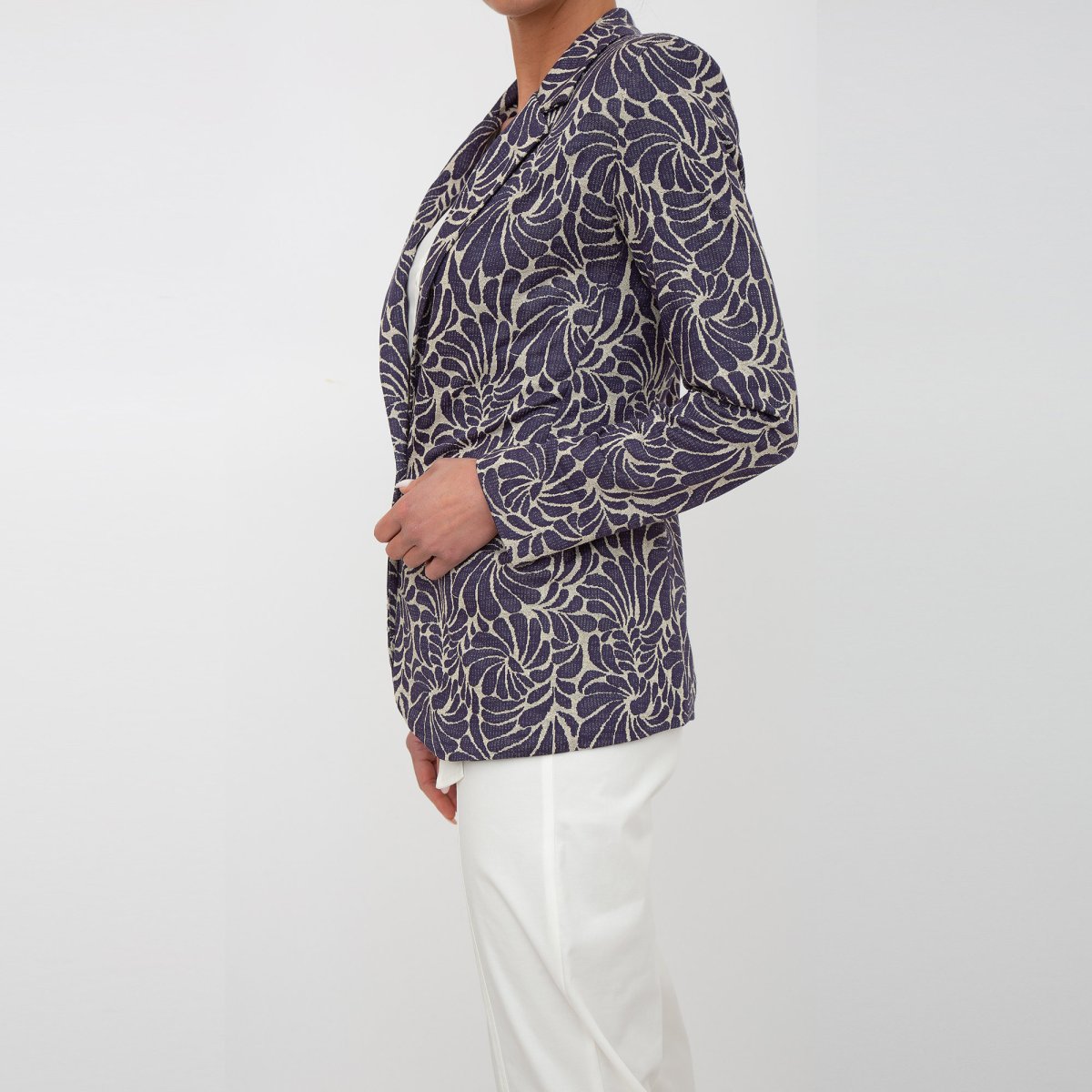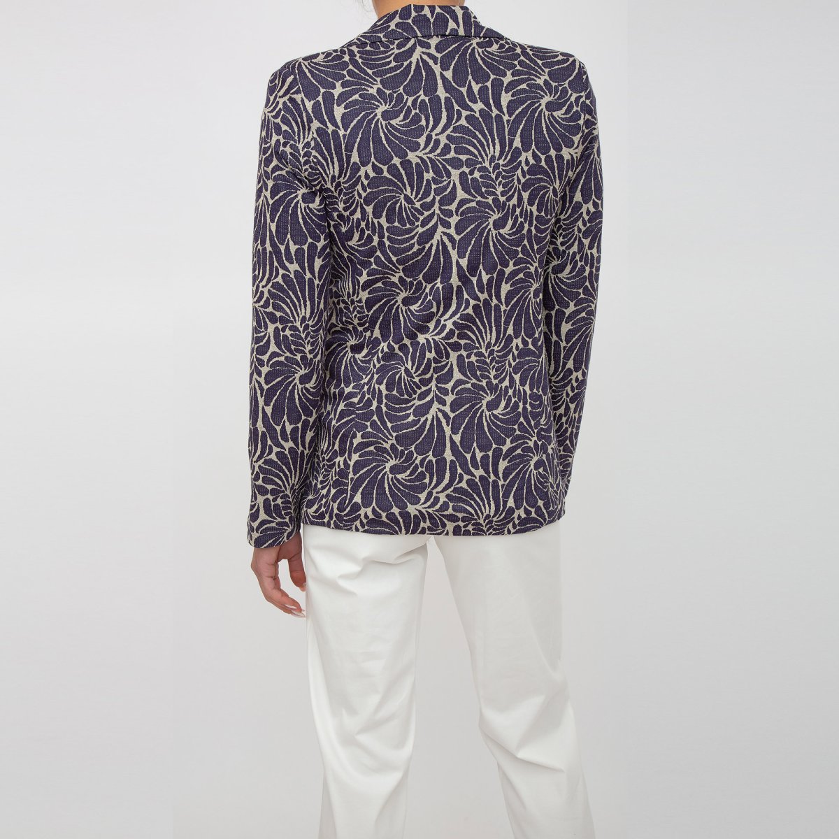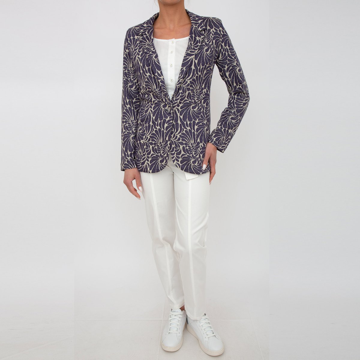 Giacca in viscosa con fantasia di fiori astratti blu su fondo color panna.