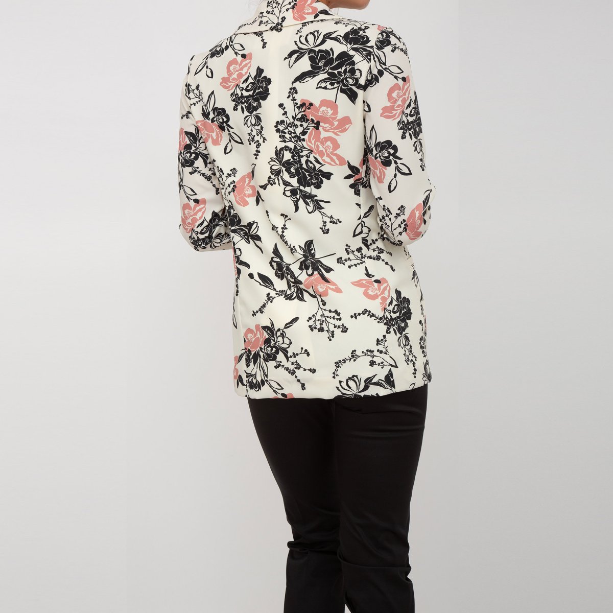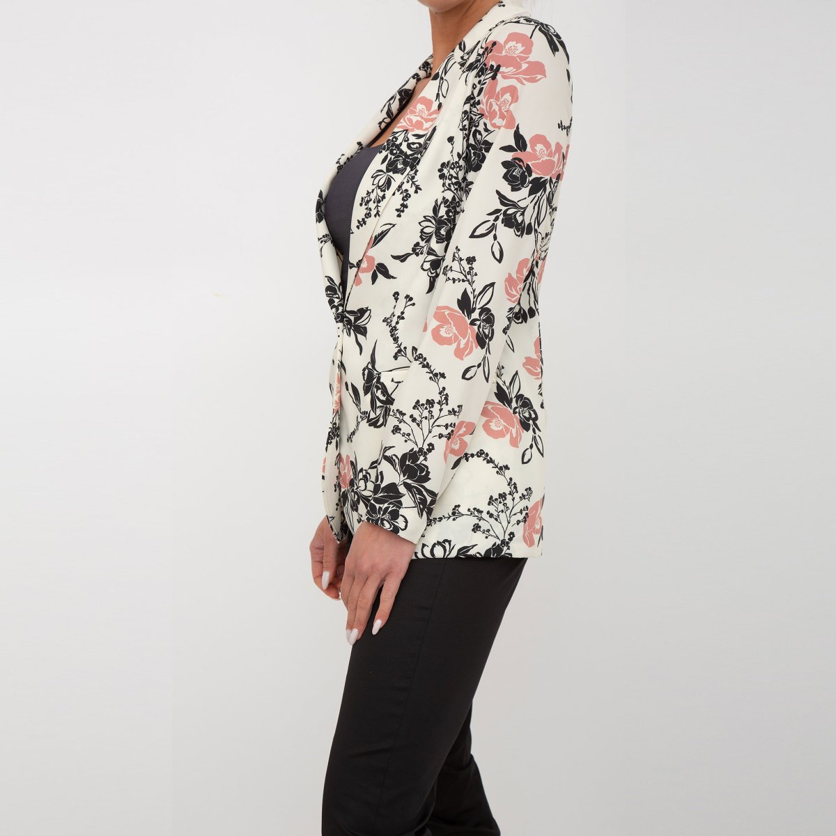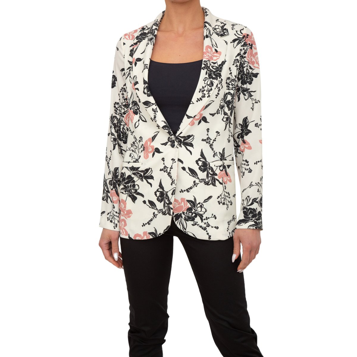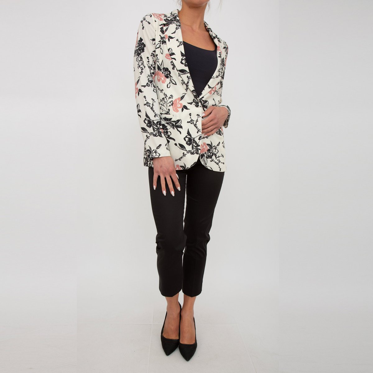 Giacca caratterizzata da una fantasia floreale, chiusura con bottone e tasche sui fianchi.