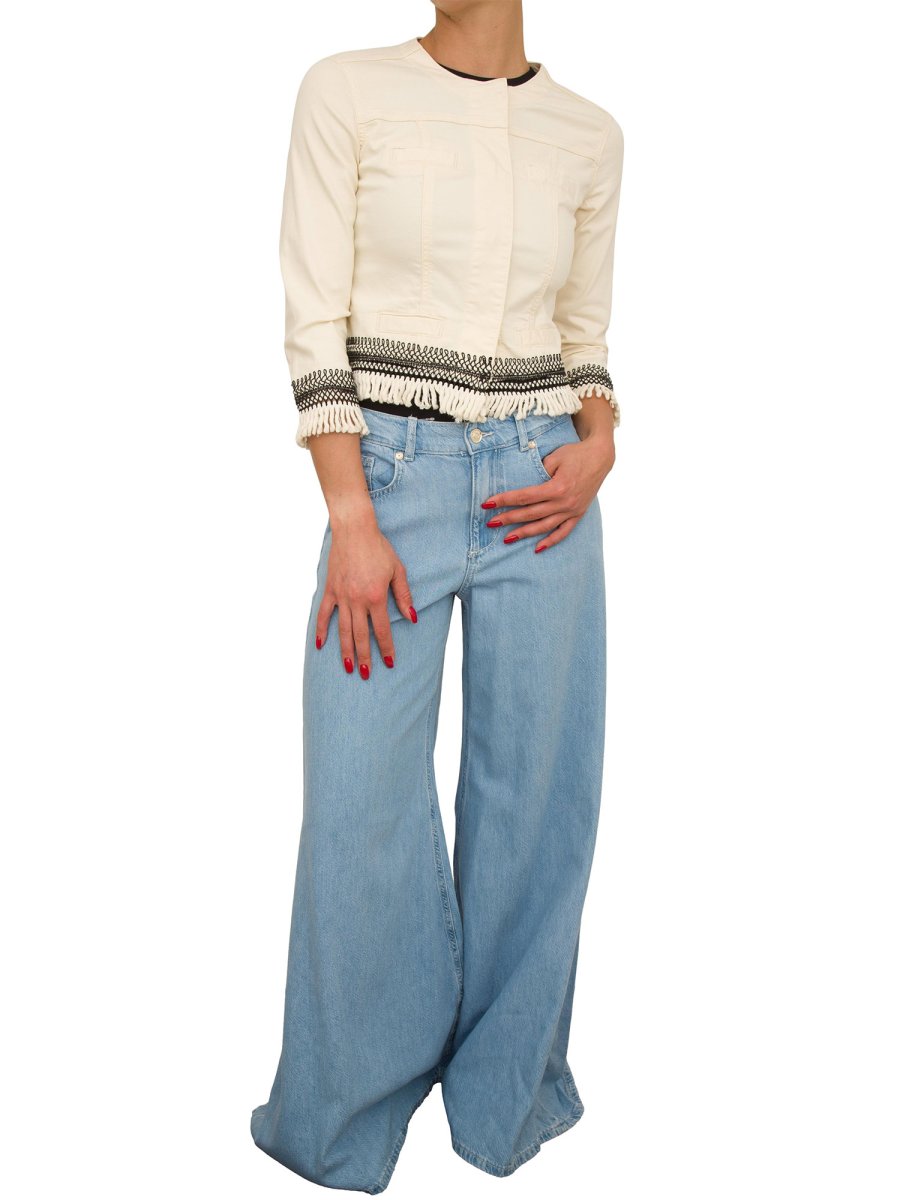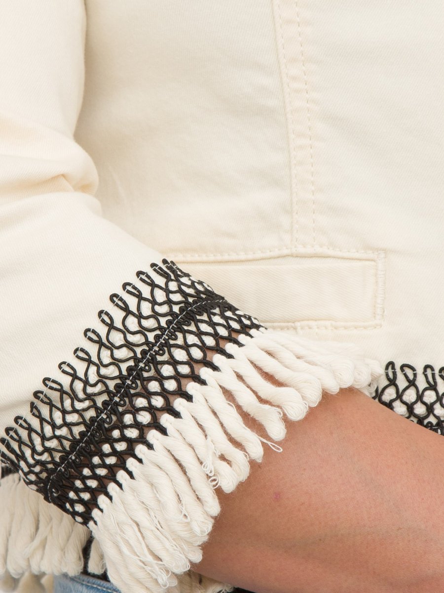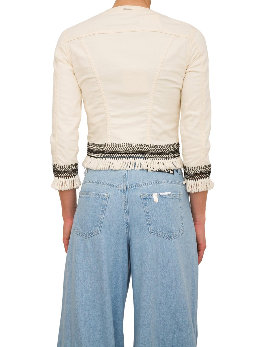 Giacca con frange Liu-jo realizzata in gabardina di cotone stretch, taglio girocollo, taschini e tasche a filetto sul davanti, mini etichetta logata in metallo sul retro, chiusura nascosta e bordi sfrangiati.