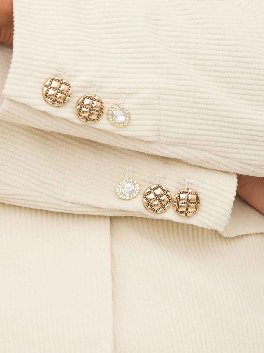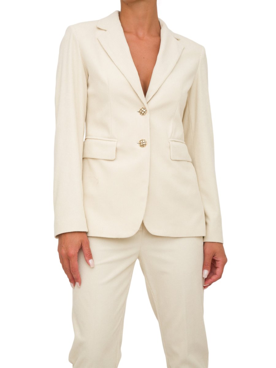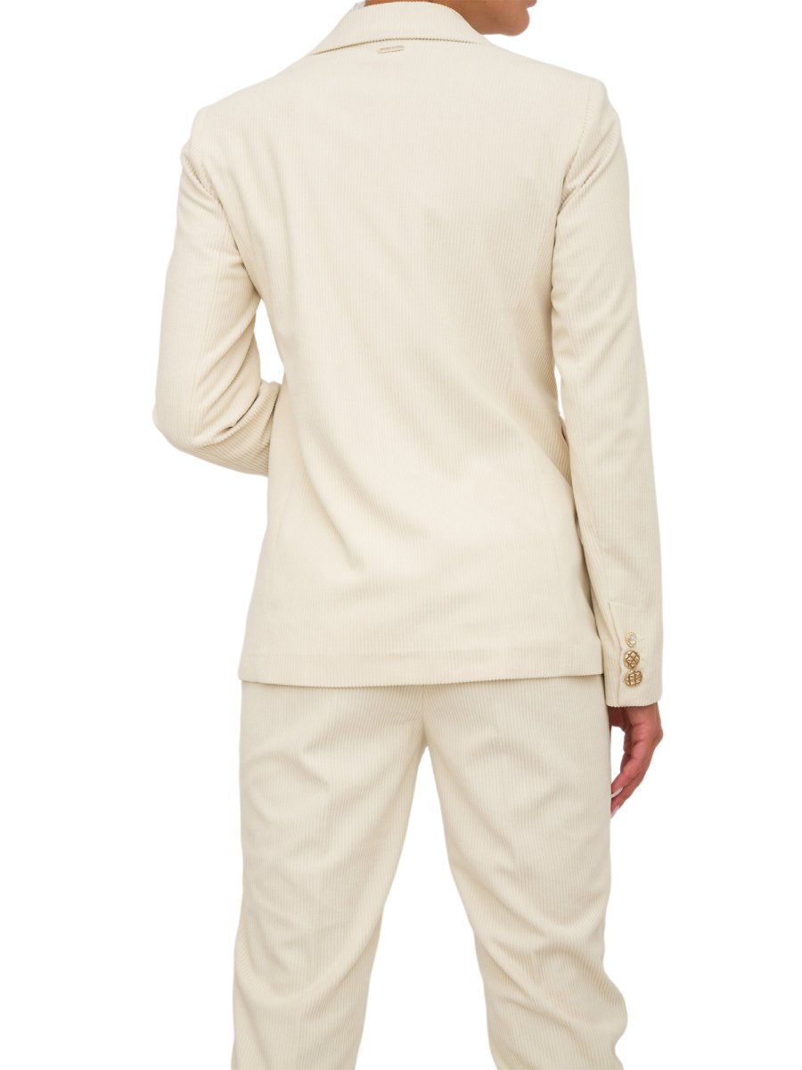 Giacca monopetto LIU JO in velluto a costine, revers classico e maniche lunghe con bottoni sui polsi. Chiusura monopetto con bottoni gioiello, tasche con patta sui lati e logo in metallo sul retro.