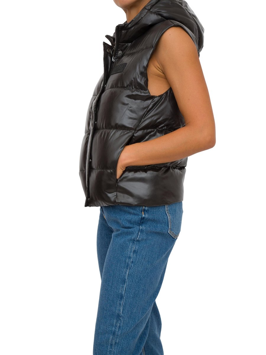 Gilet da donna Guess Jeans realizzato in tessuto sintetico, collo alto con cappuccio, senza maniche, vestibilità regular e chiusura con cerniera.