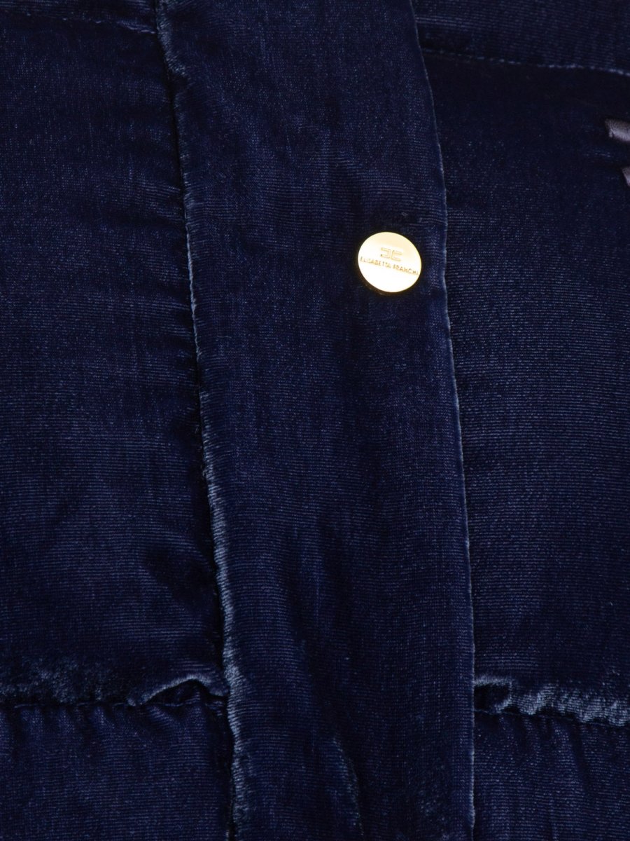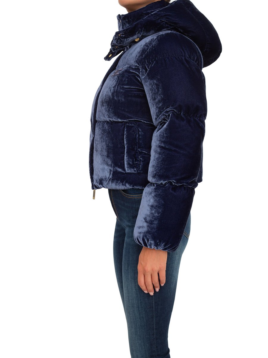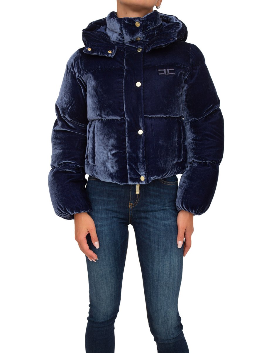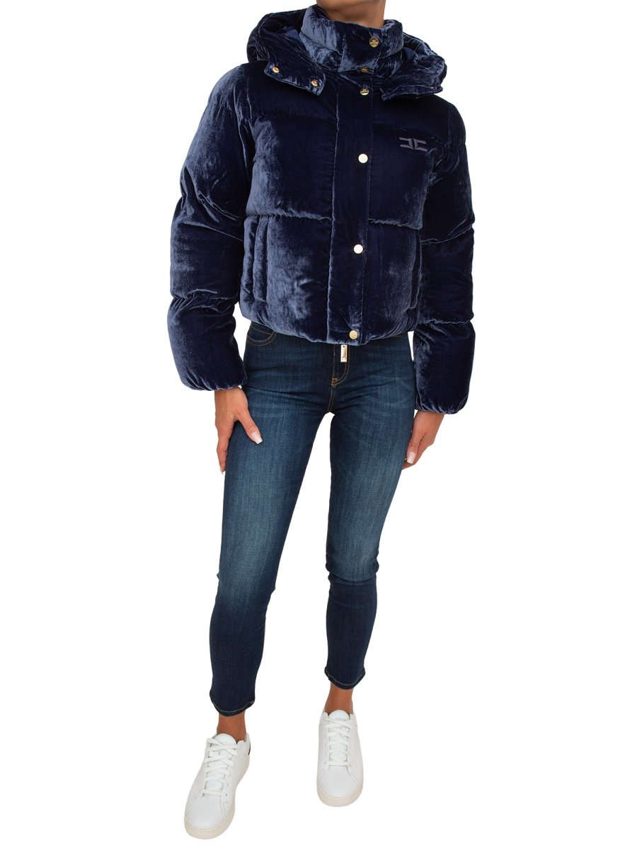 Piumino crop Elisabetta Franchi in velluto con collo a cratere. È caratterizzato da cappuccio staccabile e logo ricamato in tinta.