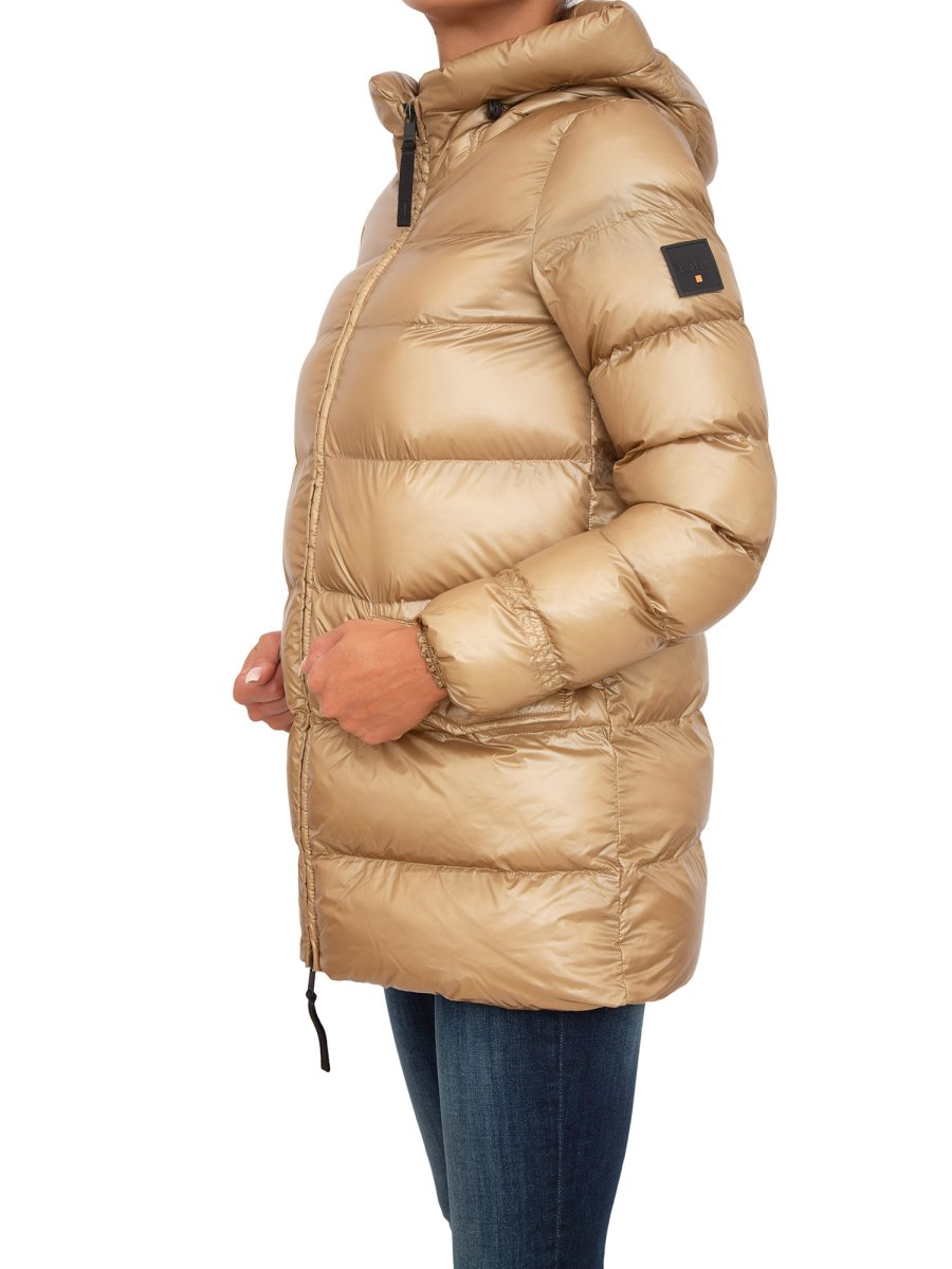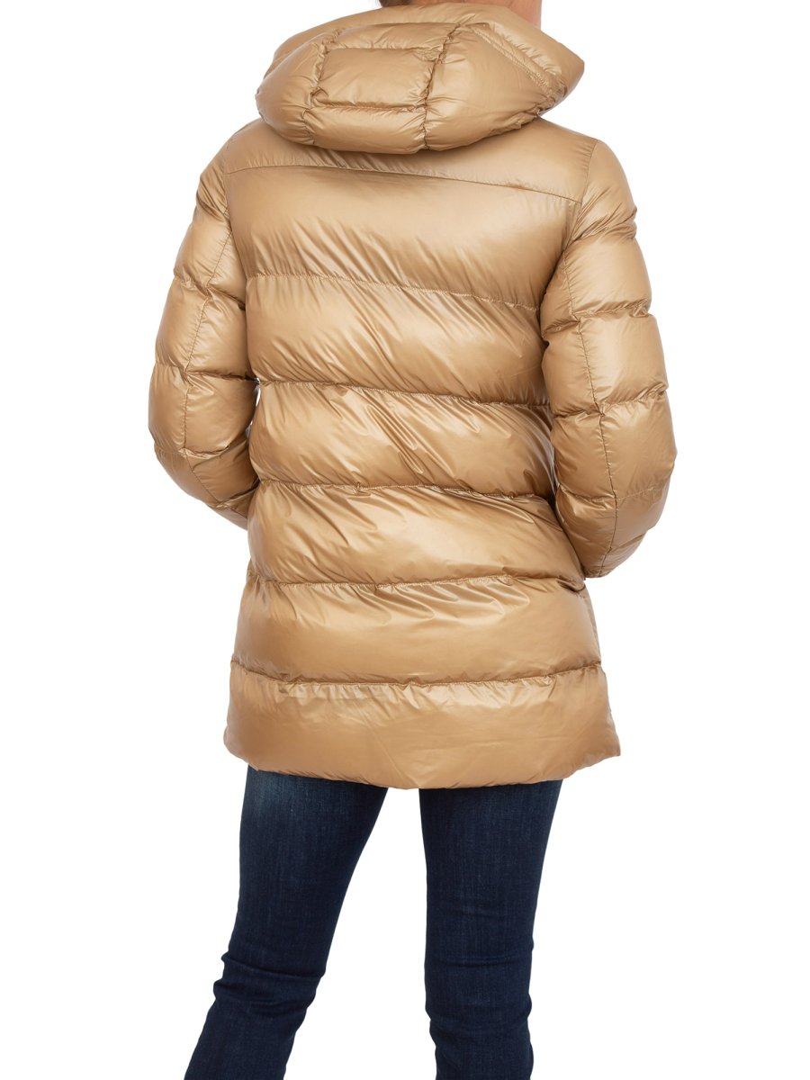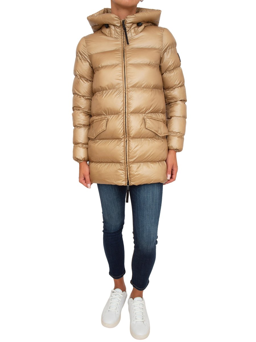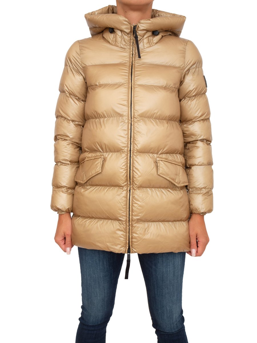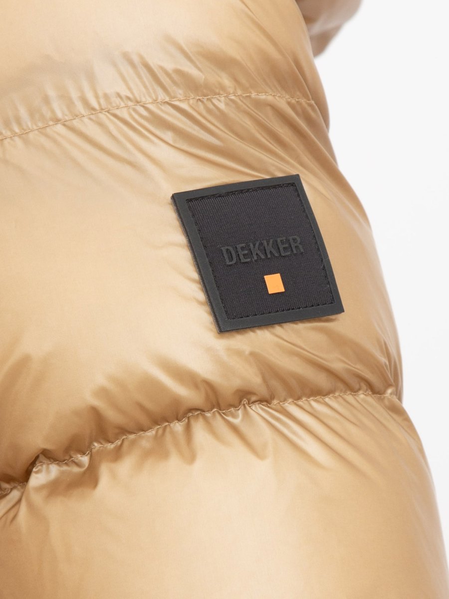 Piumino Dekker trapuntato a canali di media lunghezza dalla linea diritta, in nylon laqué ottenuto per calandratura. Cappuccio fisso con regolazione con coulisse, tasche con patta e bottoni automatici. Tessuto water repellent.