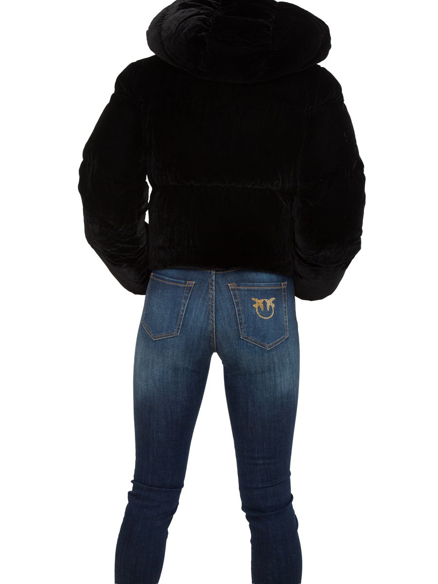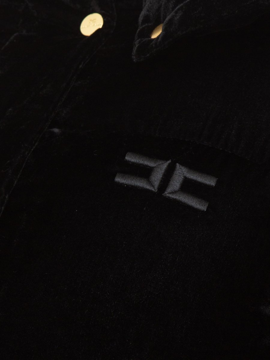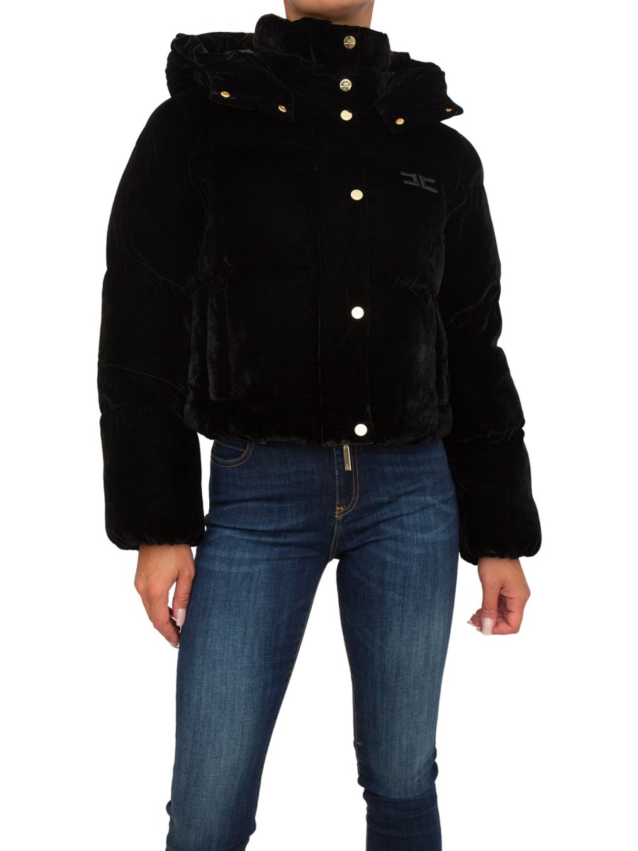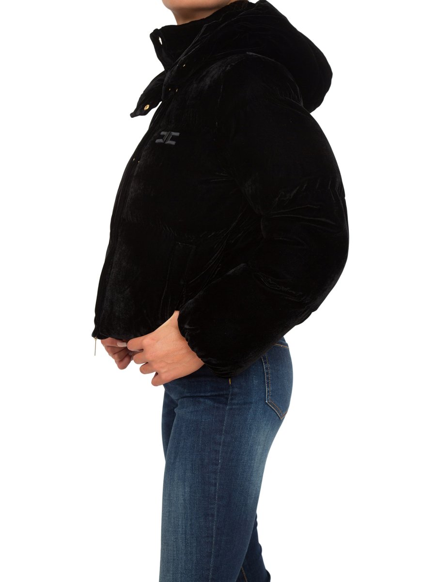 Piumino crop Elisabetta Franchi in velluto con collo a cratere. È caratterizzato da cappuccio staccabile e logo ricamato in tinta.
