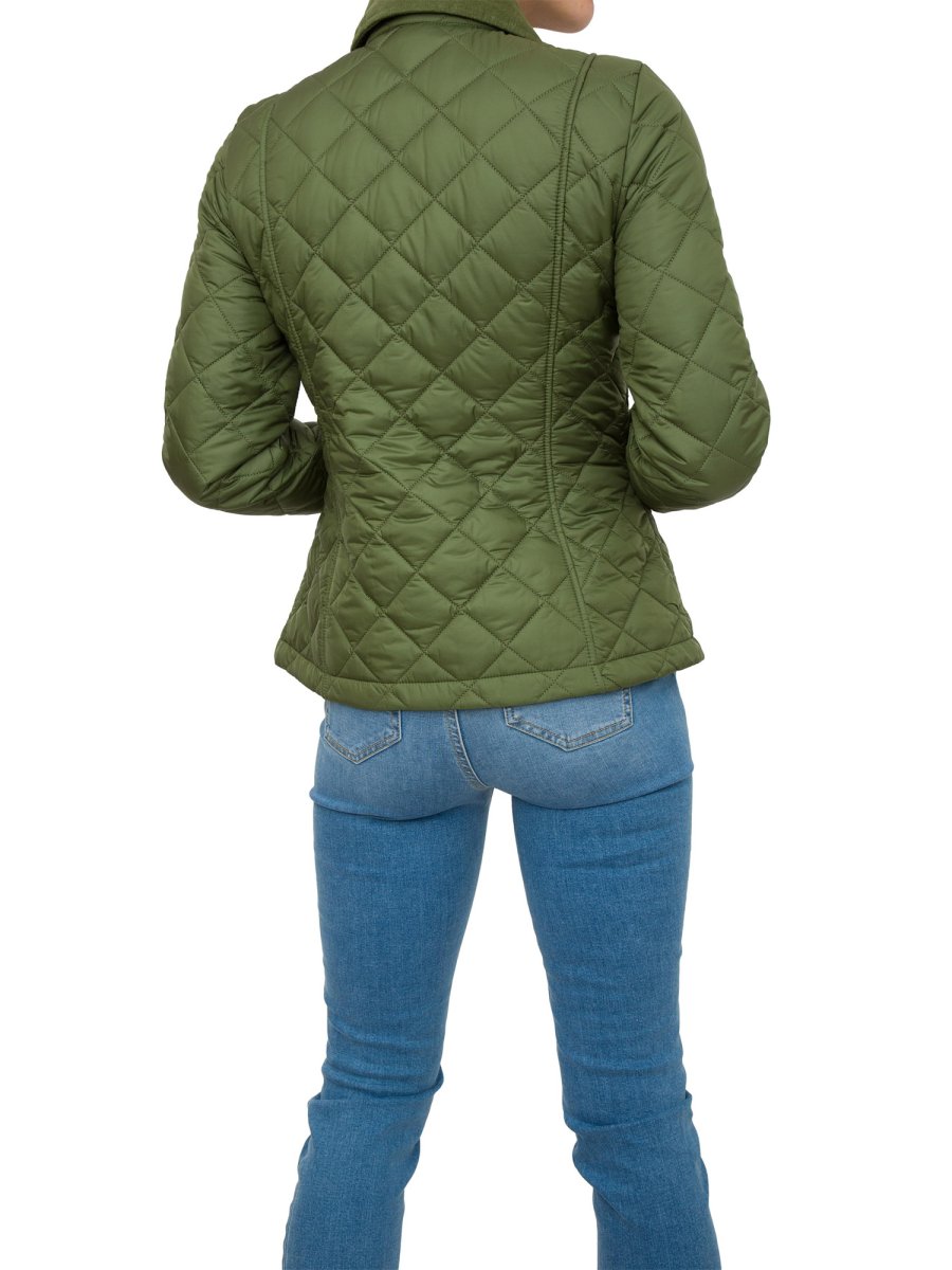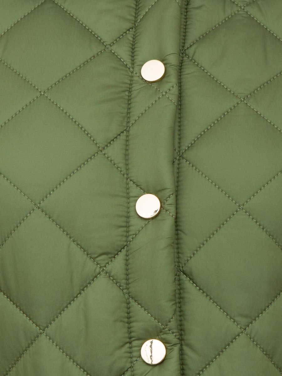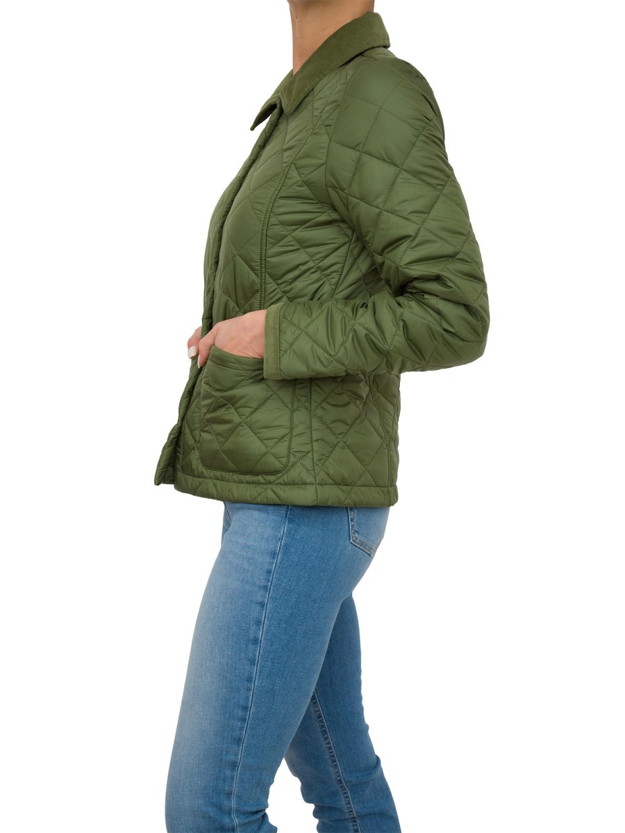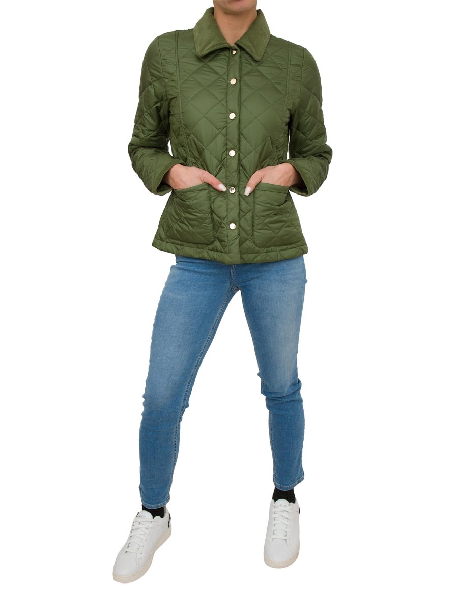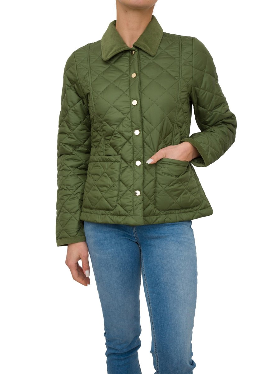 Giacca-camicia imbottita trapuntata, linea dritta. Collo a camicia in velluto, maniche lunghe con polsino in velluto. Chiusura con automatici, tasche applicate.