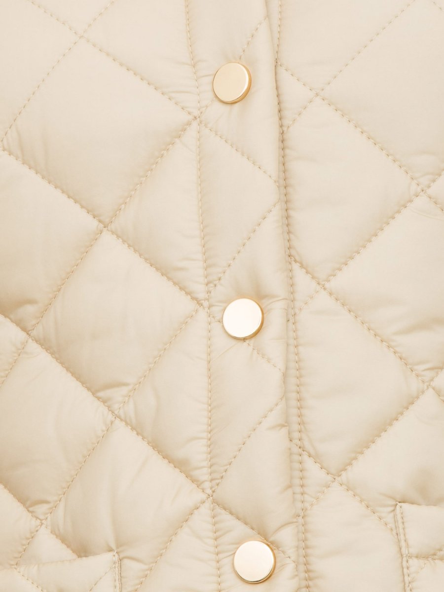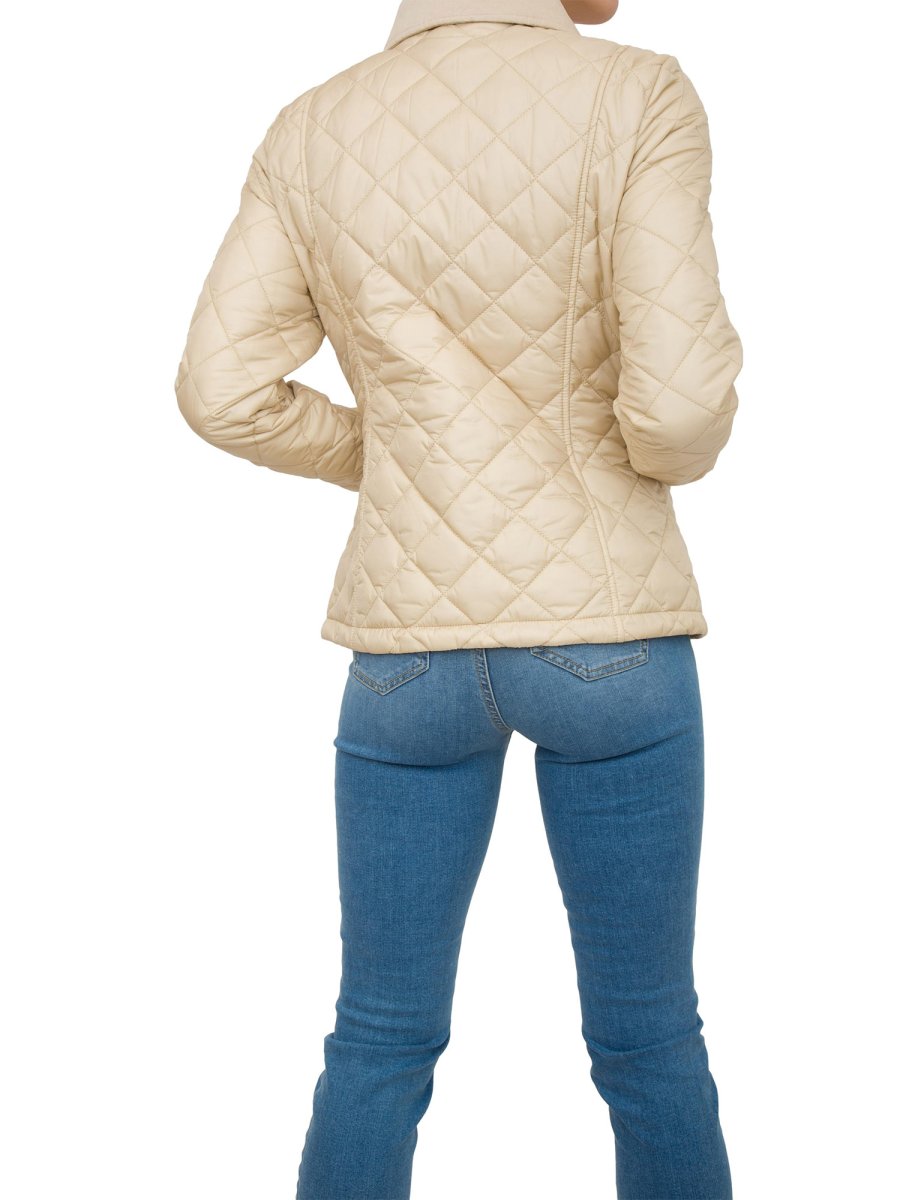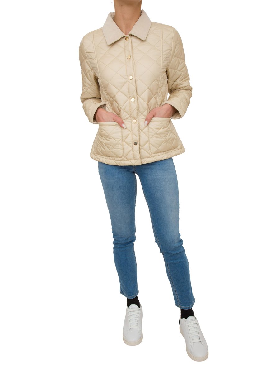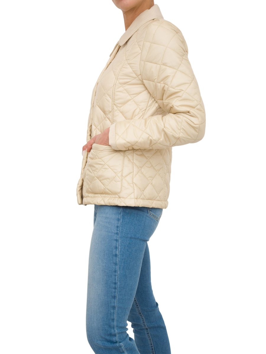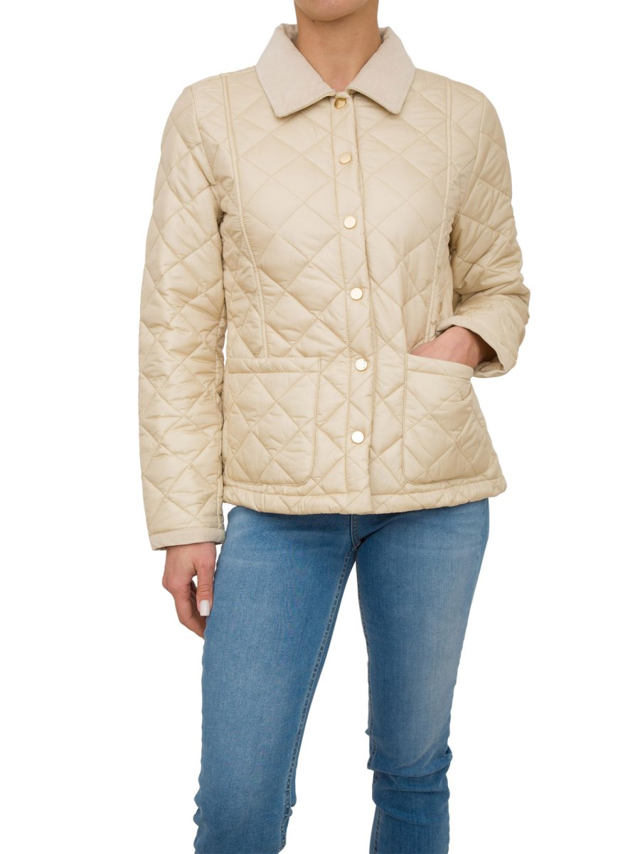 Giacca-camicia imbottita trapuntata, linea dritta. Collo a camicia in velluto, maniche lunghe con polsino in velluto. Chiusura con automatici, tasche applicate.