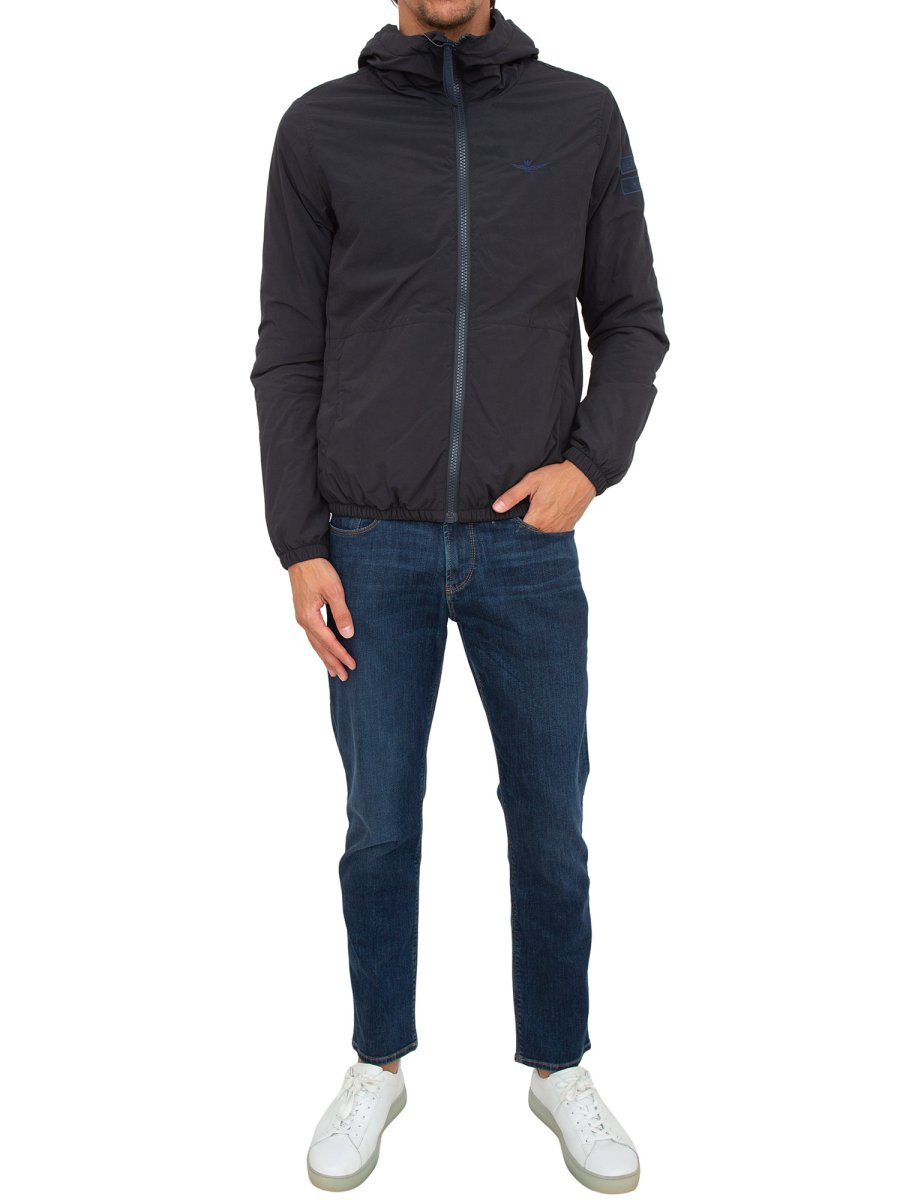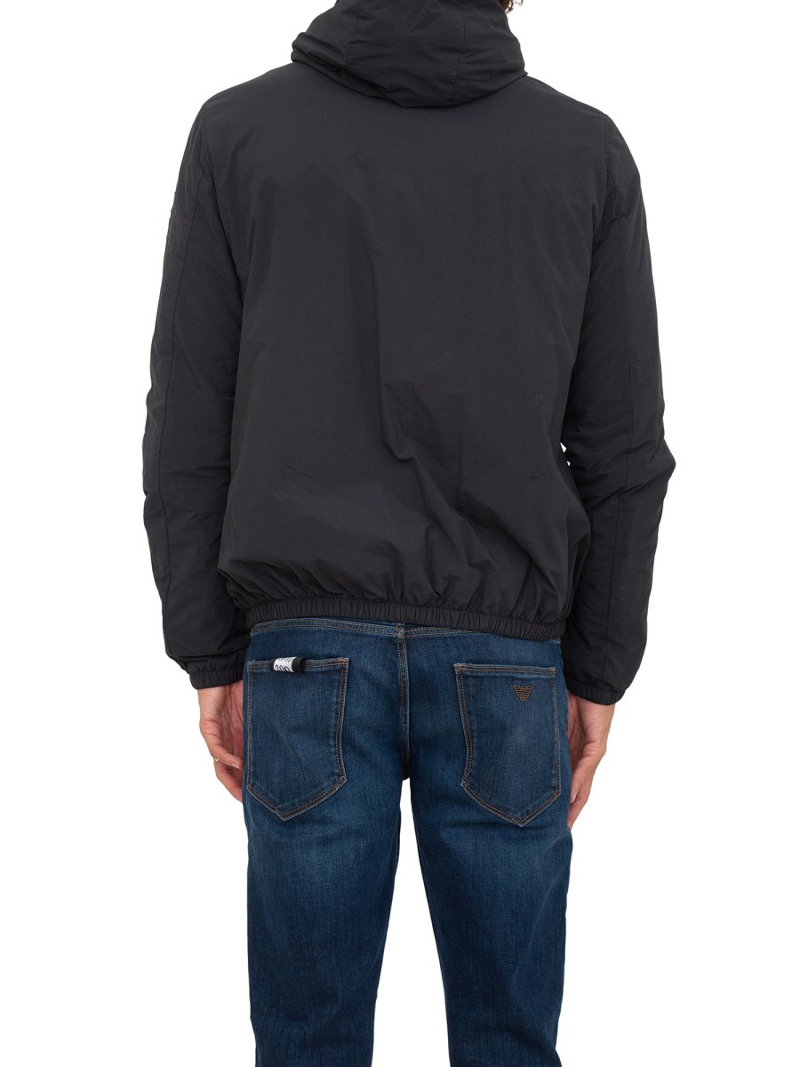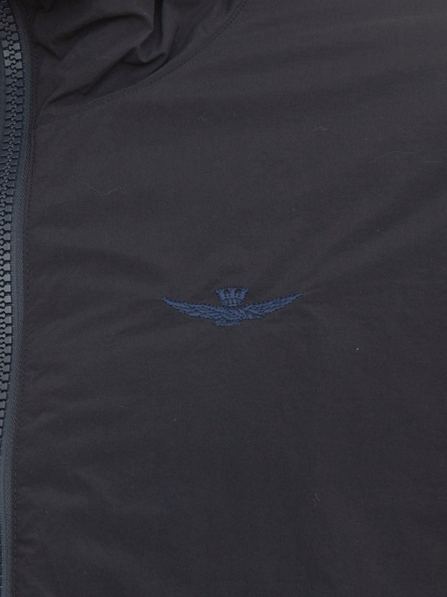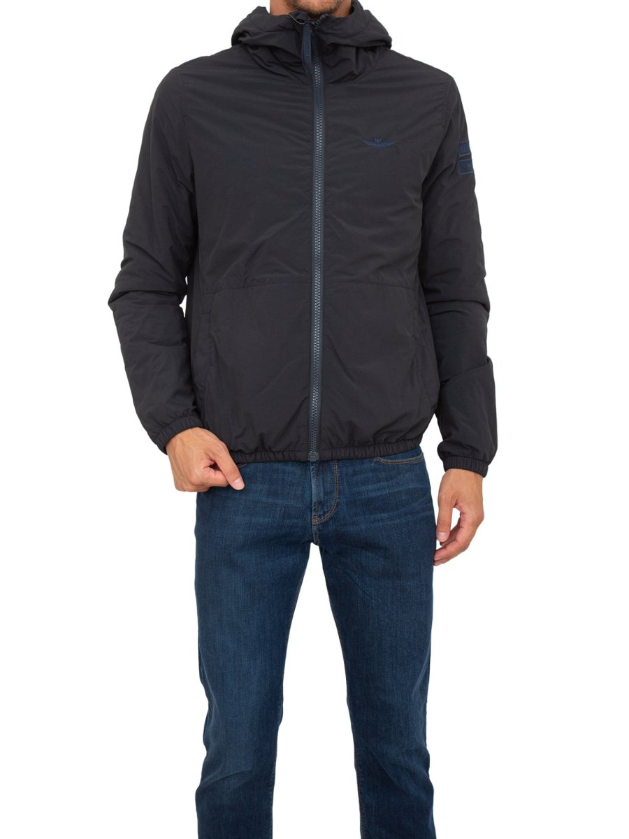 Giubbino con cappuccio Aeronautica Militare in nylon riciclato leggermente imbottito. Il particolare finissaggio con cui è stato realizzato conferisce un aspetto vintage, i ricami in tono raffiguranti l'iconica aquila turrita e la patch del logo lo arricchiscono con discrezione.
