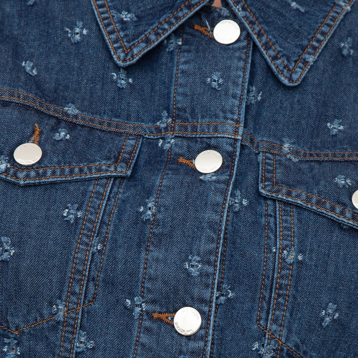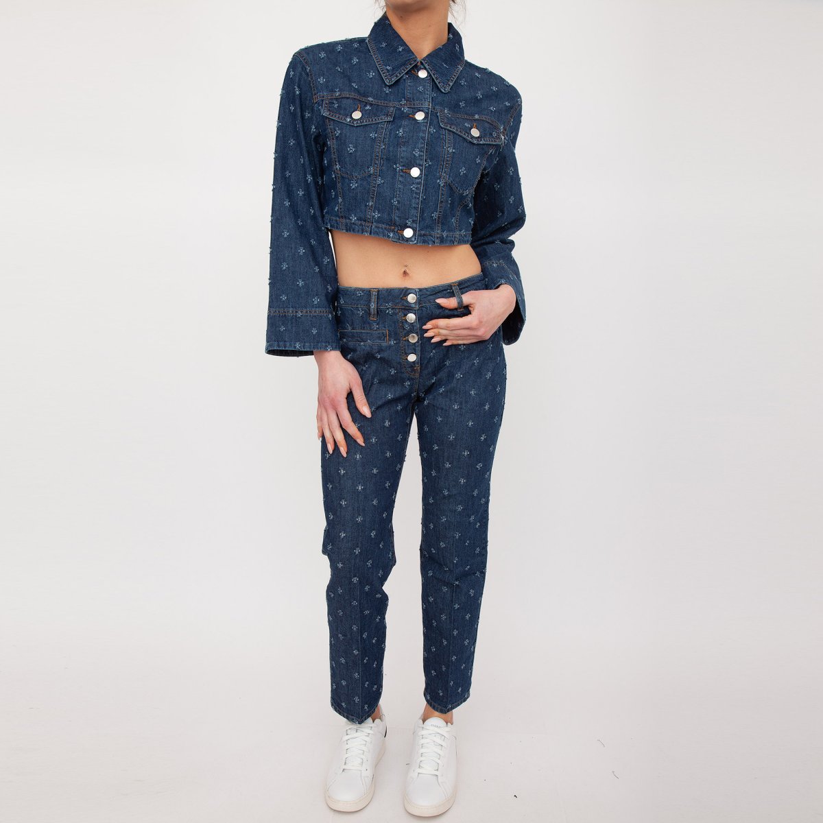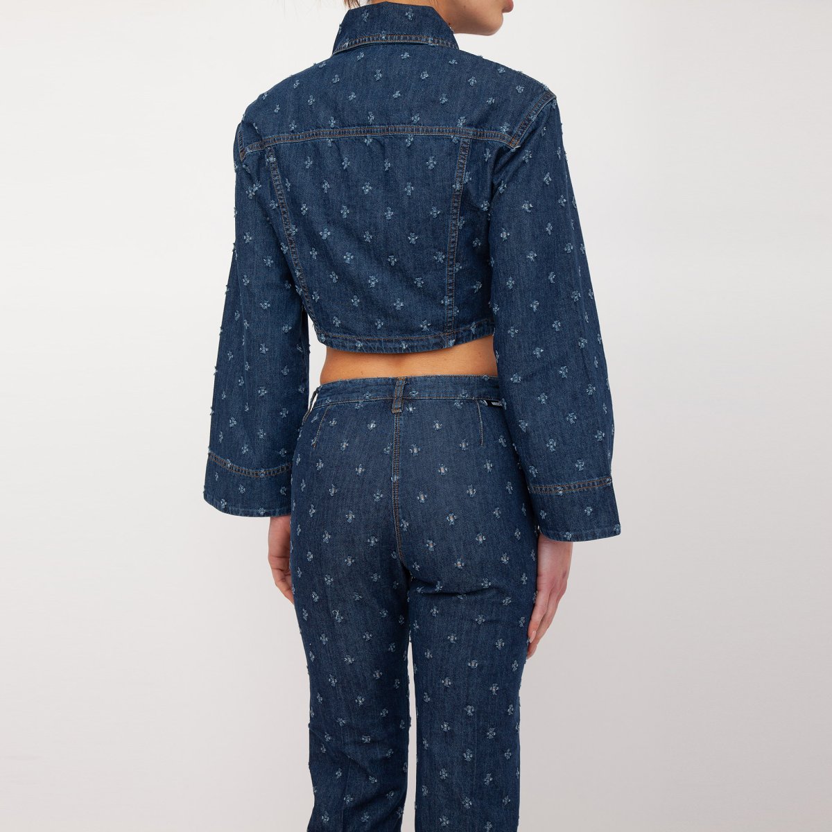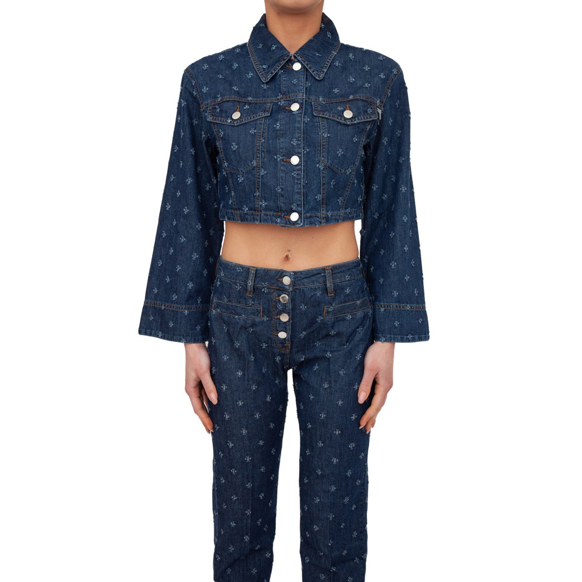 Giacca cropped in denim laserato, due tasche sul davanti con pattina e bottone, maniche ampie svasate e chiusura sul davanti con bottoni.