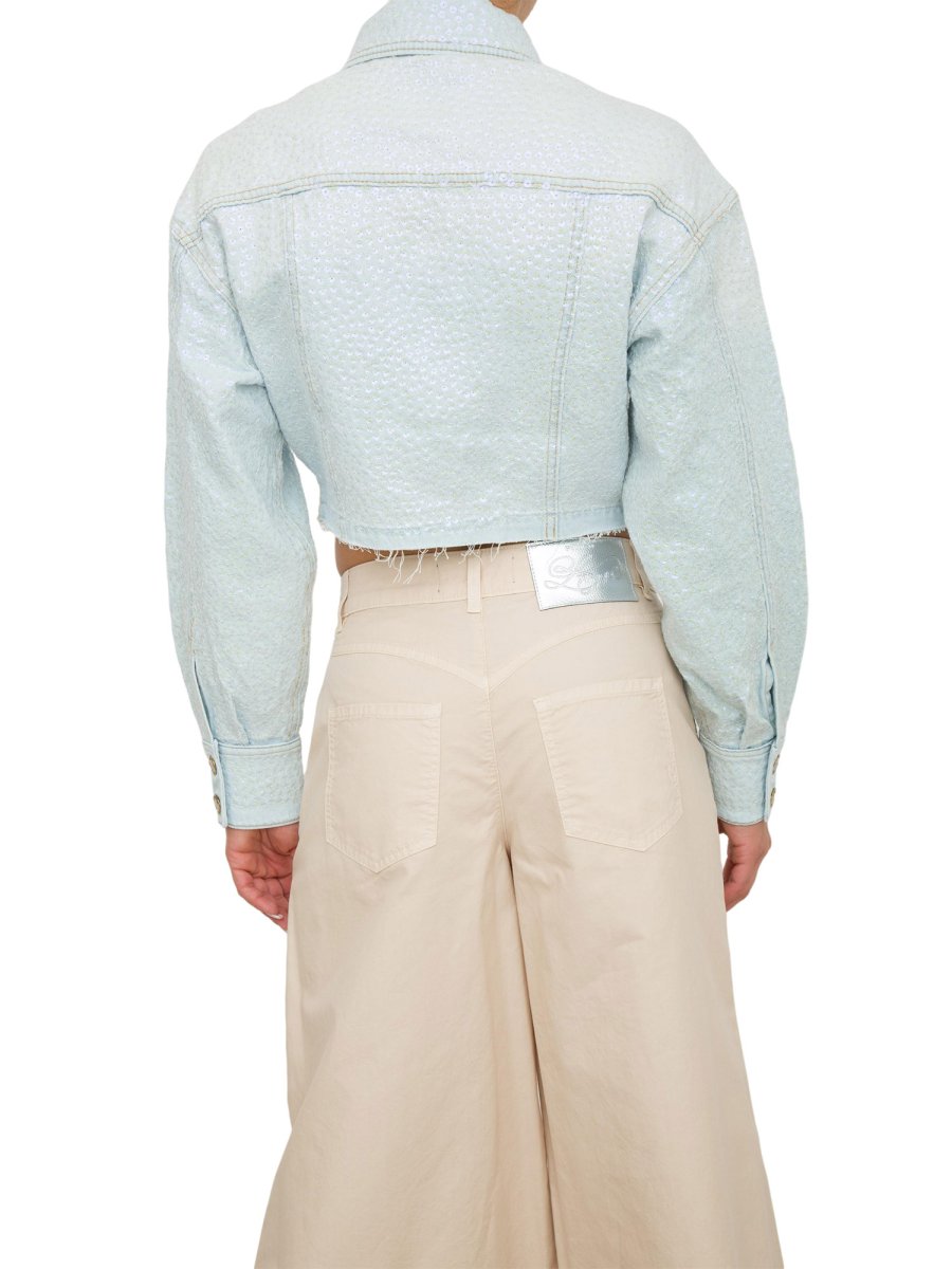Giubbino corto in denim comfort baby blue, lavaggio bleached chiaro, ricamato con paillettes iridescenti. Colletto a camicia, taschini con patta e maniche lunghe a giro basso. Chiusura con bottoni a chiodo in metallo.
