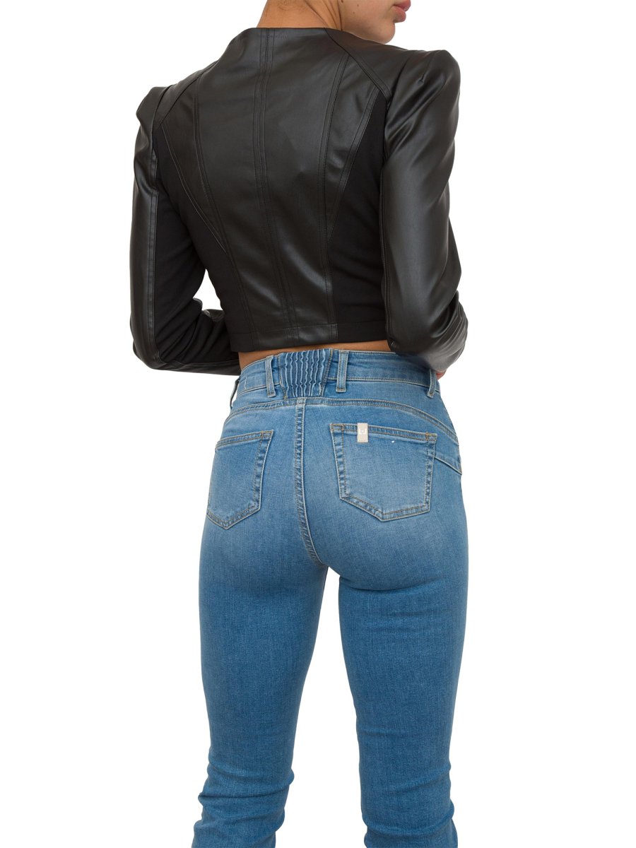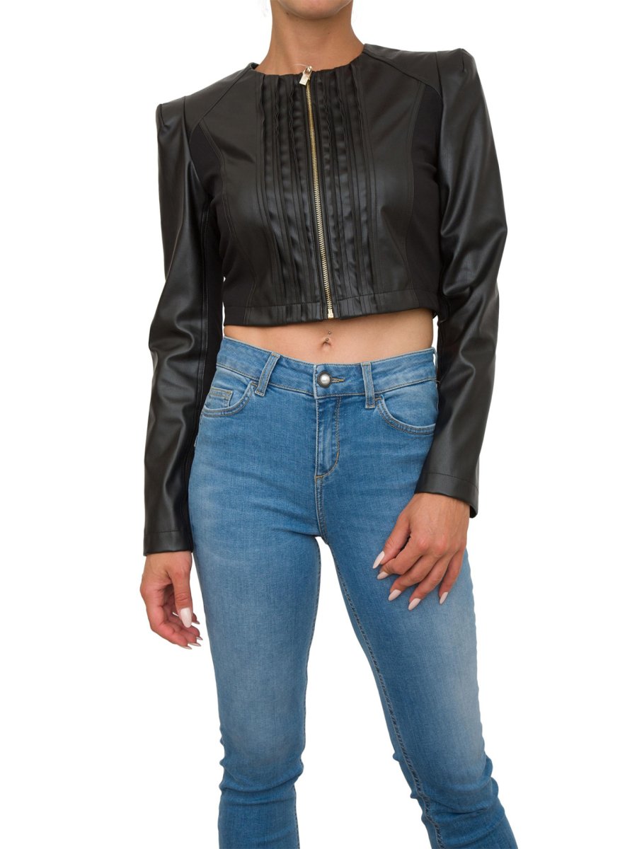 Giacca cropped effetto pelle e punto Milano con spalline sagomate, maniche a sbuffo, chiusura con zip, motivo di balze a taglio vivo davanti.