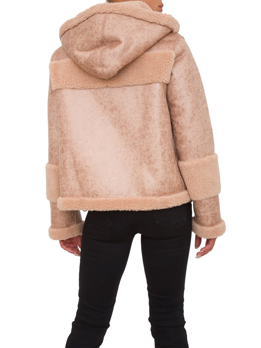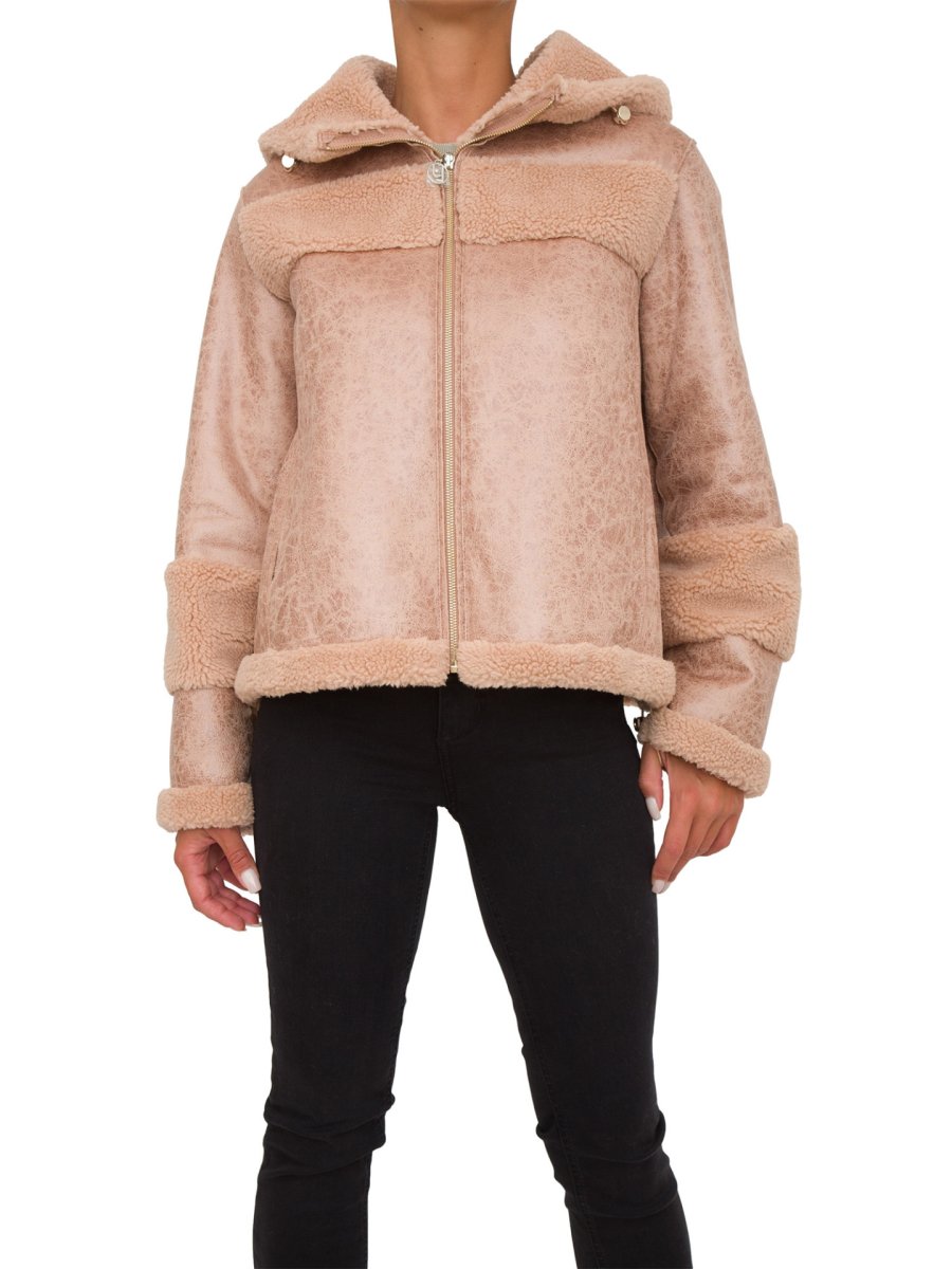 Giaccone donna Liu-jo in tessuto spalmato effetto montone, dettagli in teddy, collo alto, cappuccio con coulisse e chiusura con zip.