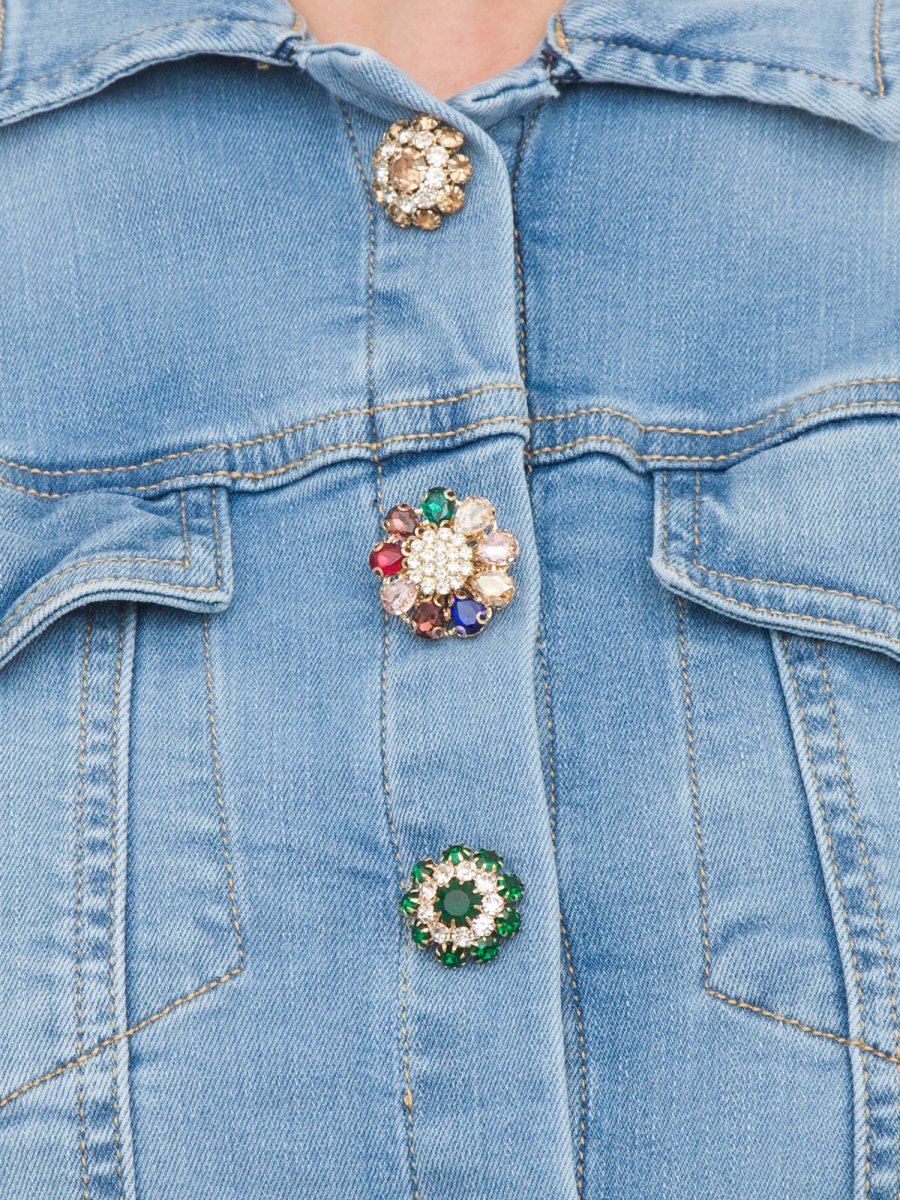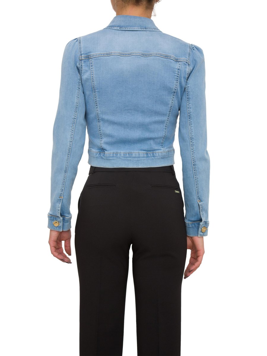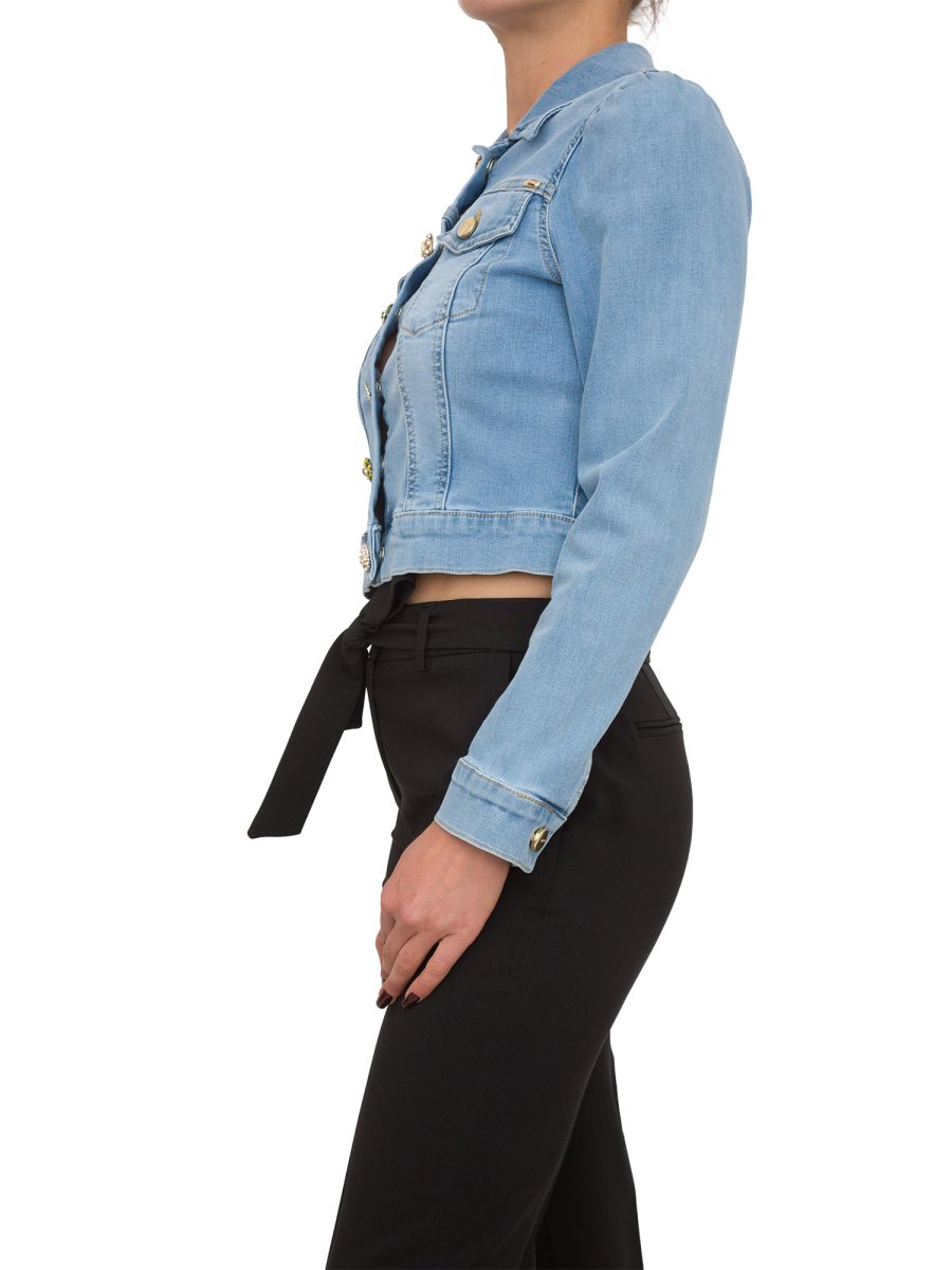 Giubbotto corto Kocca, in denim di cotone a lavaggio medio, con tasche anteriori con pattina e chiusura con bottoni brillanti diversi.