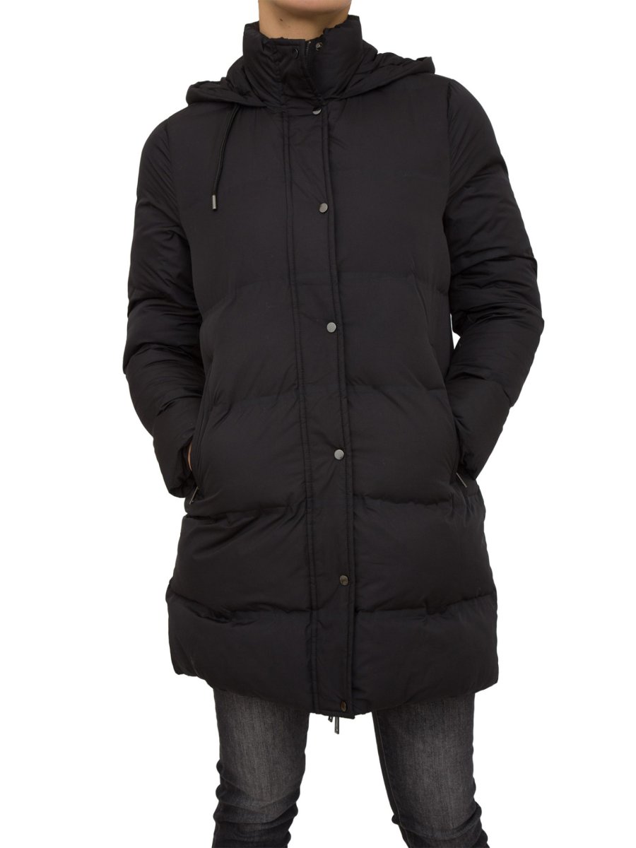 Piumino invernale lungo Kocca, trapuntato, con collo alto, cappuccio, chiusura con bottoni automatici color oro e tasche laterali con cerniera.