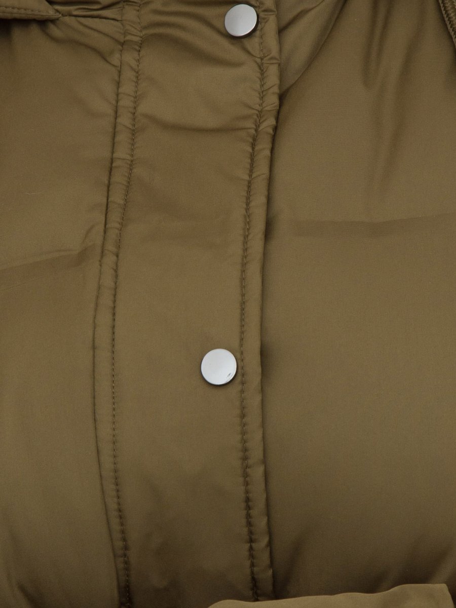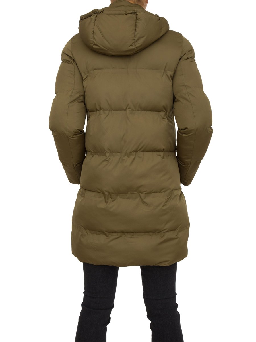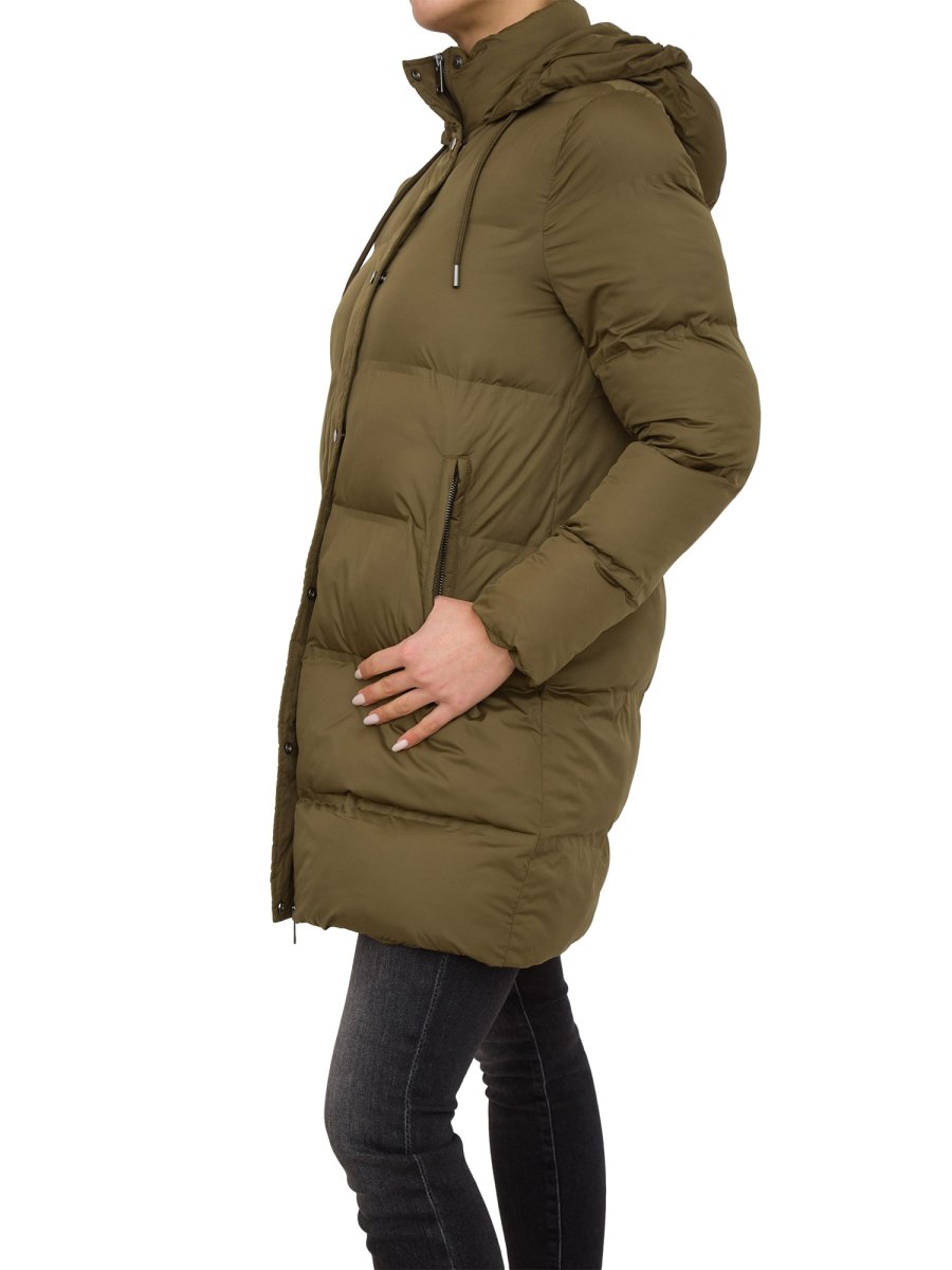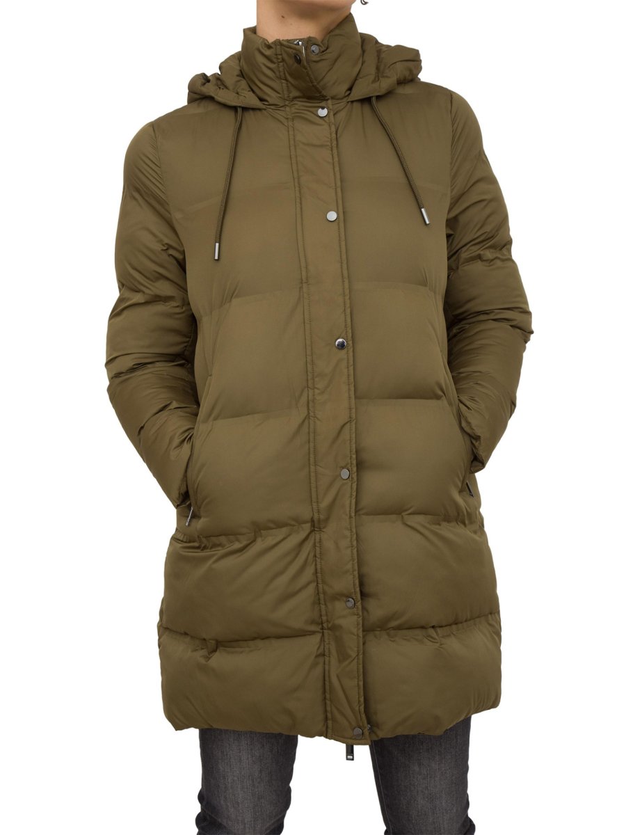 Piumino invernale lungo Kocca, trapuntato, con collo alto, cappuccio, chiusura con bottoni automatici color oro e tasche laterali con cerniera.