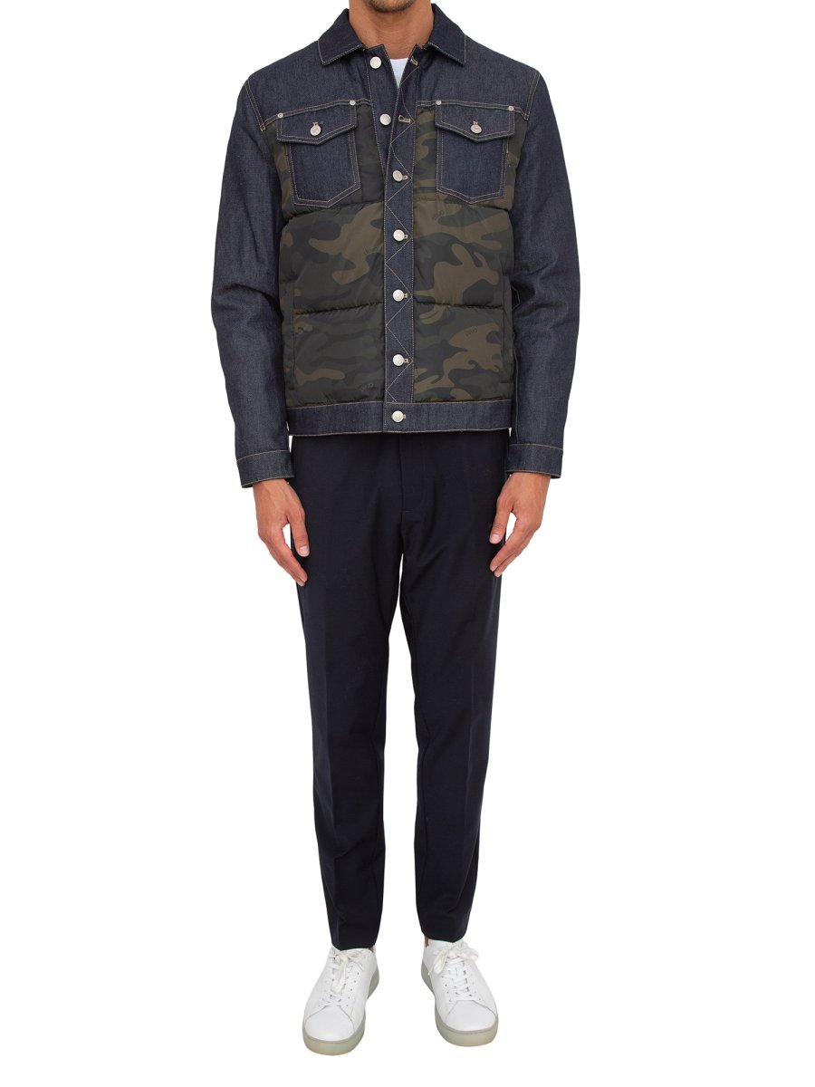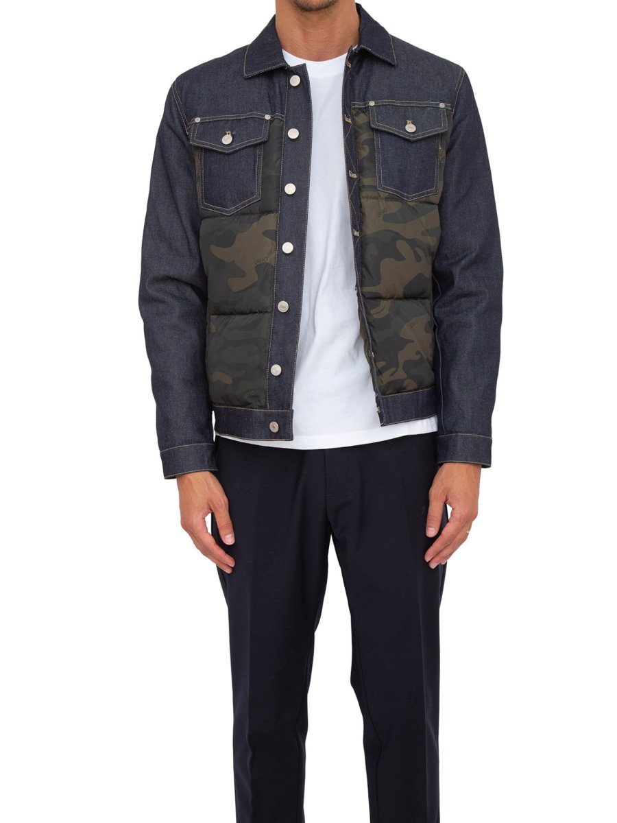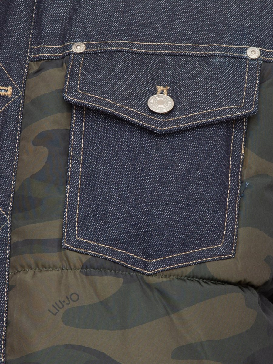 Giubbino uomo Liu-Jo denim con stampa camouflage. Design imbottito, design con pannelli, design trapuntato, dettaglio decorativo con doppio bottone, targhetta con logo, colletto button-down, maniche lunghe, orli con bottone, due tasche con patta sul petto, due tasche laterali a filetto e orlo dritto.