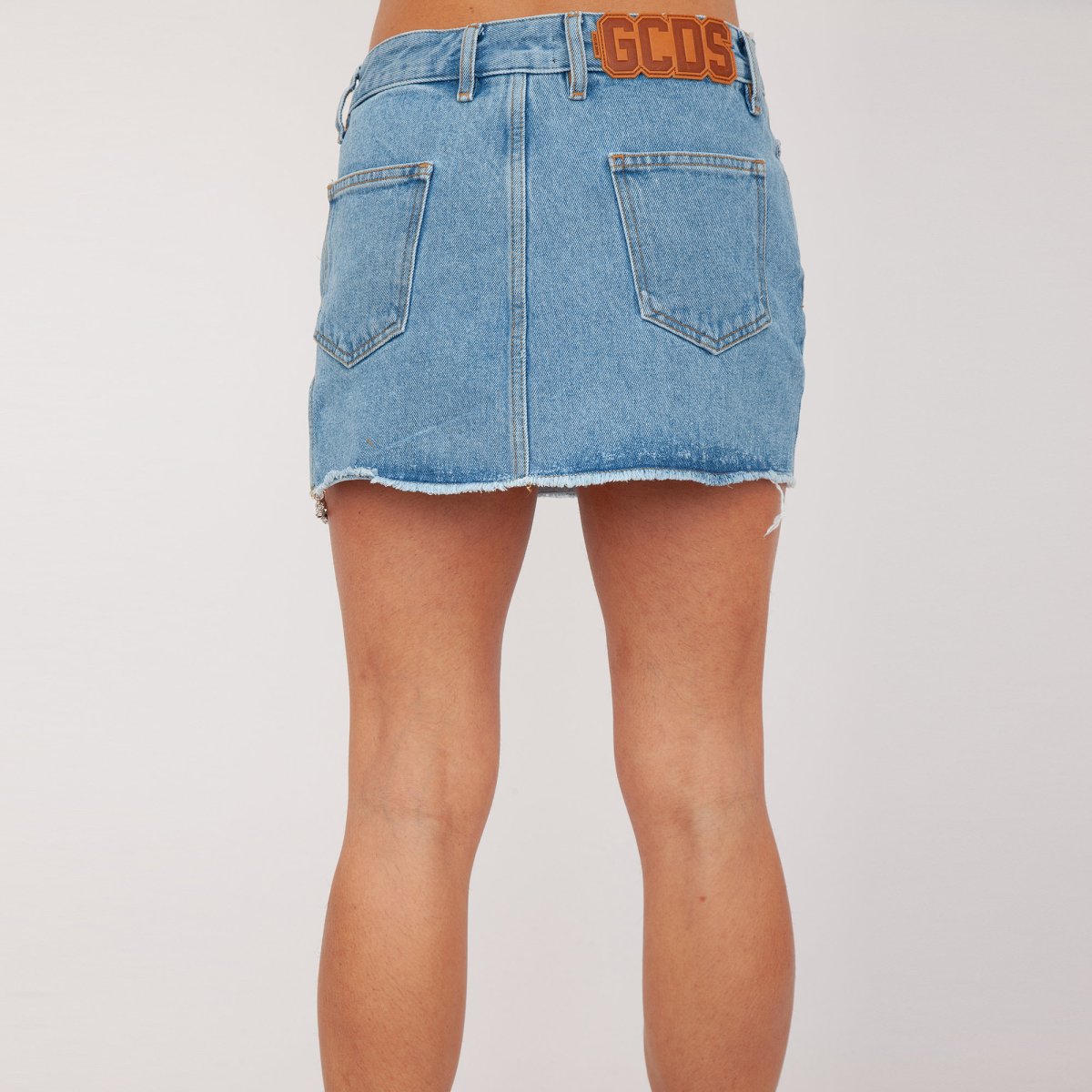 Minigonna a vita bassa in denim con lavaggio stone wash light bleached. Impunture color tabacco. Spacco laterale su gamba sinistra con dettaglio choker logo GCDS in cristalli. Fondo a taglio vivo.