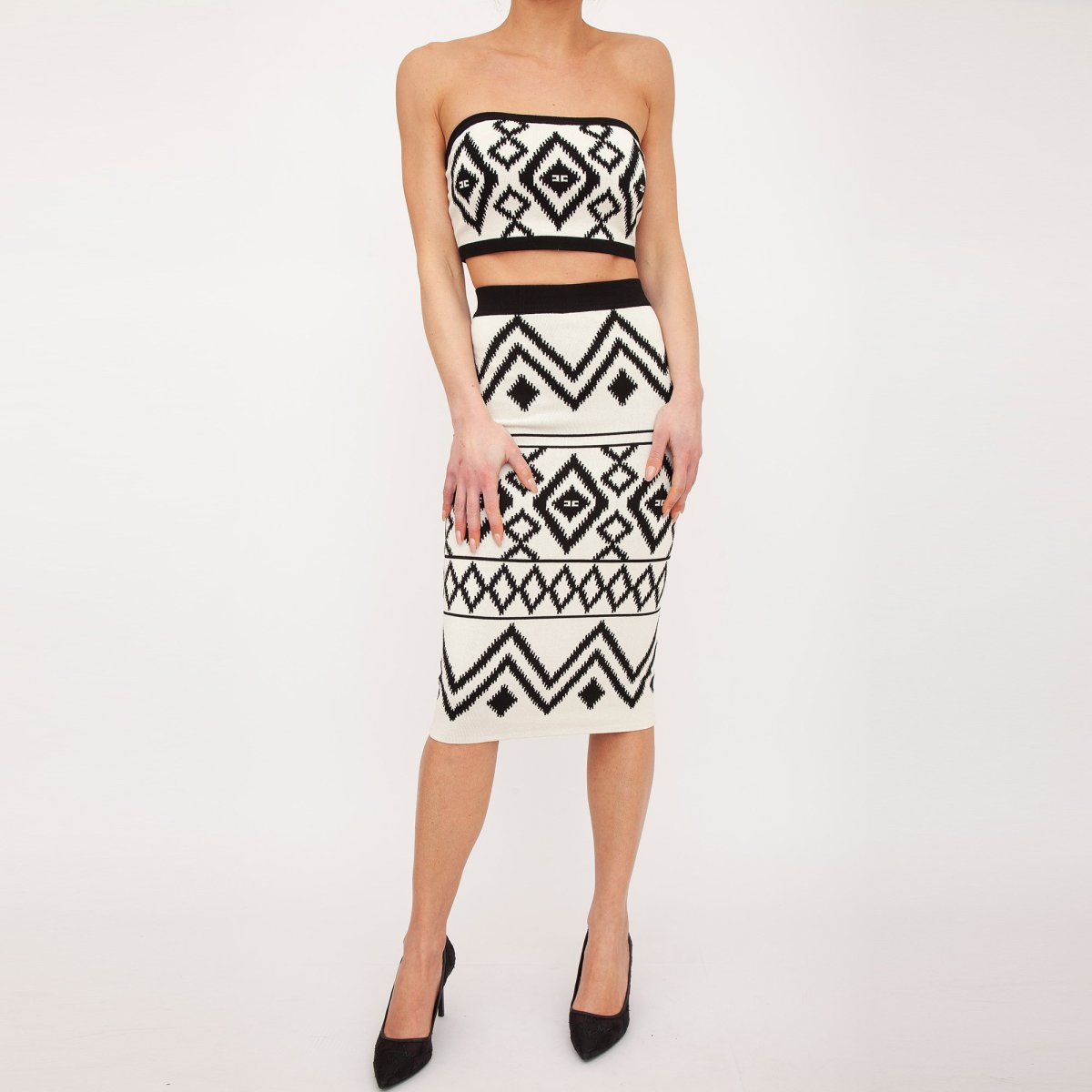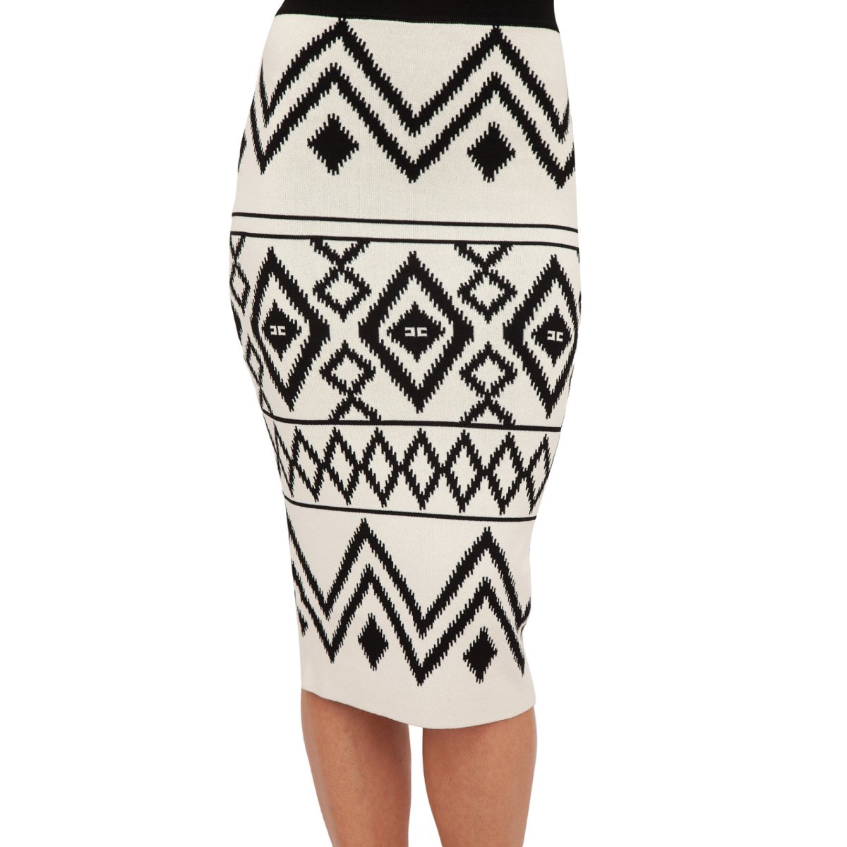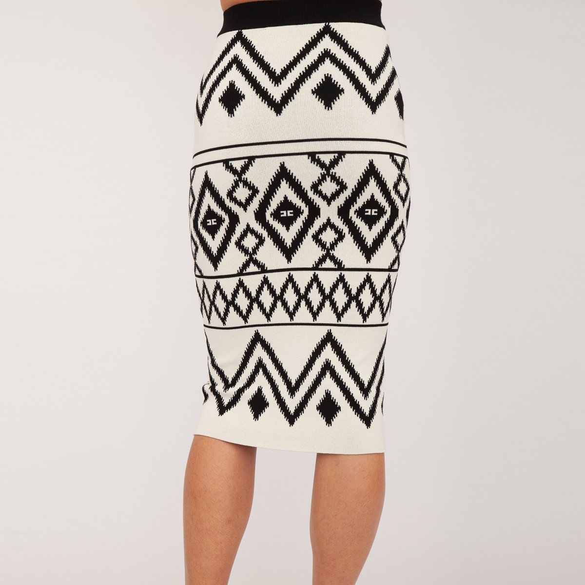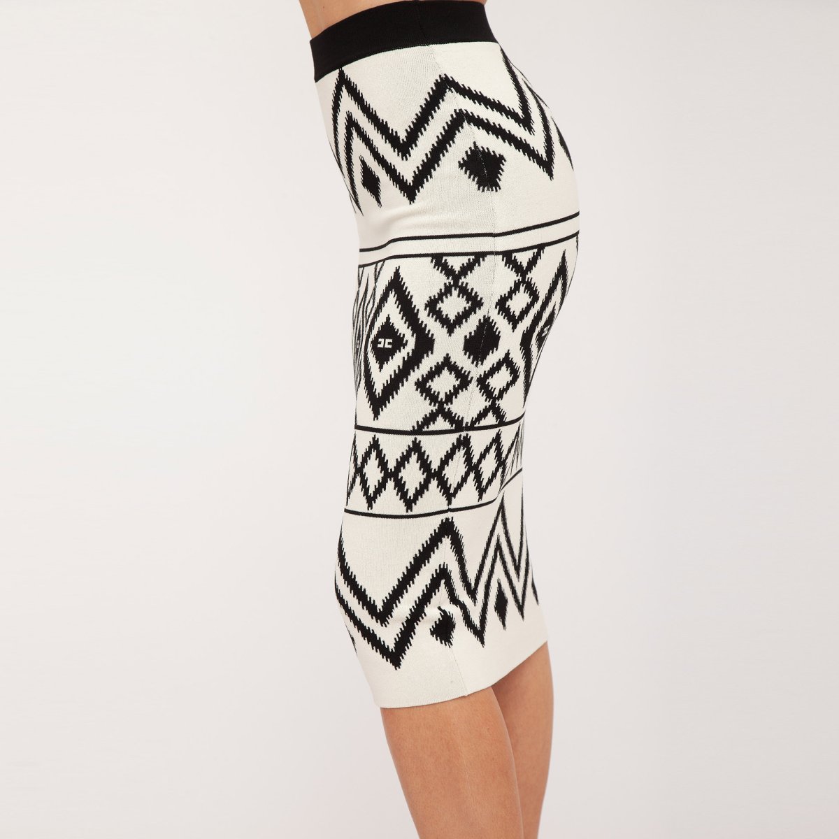 - Описание88% VISCOSE 12%Gonna longuette con grafica jacquard disegno rombo etnico all over. Zip invisibile al fianco.