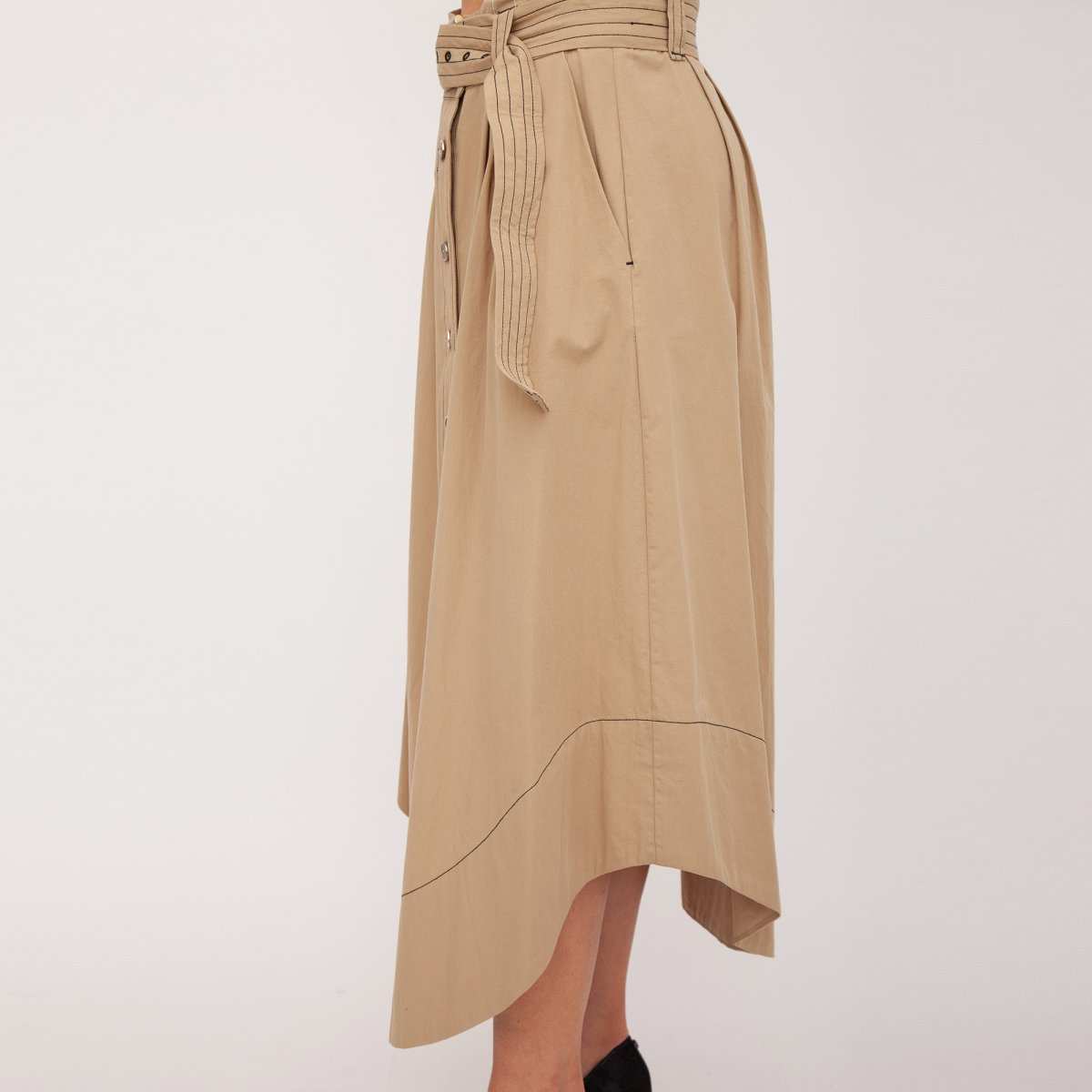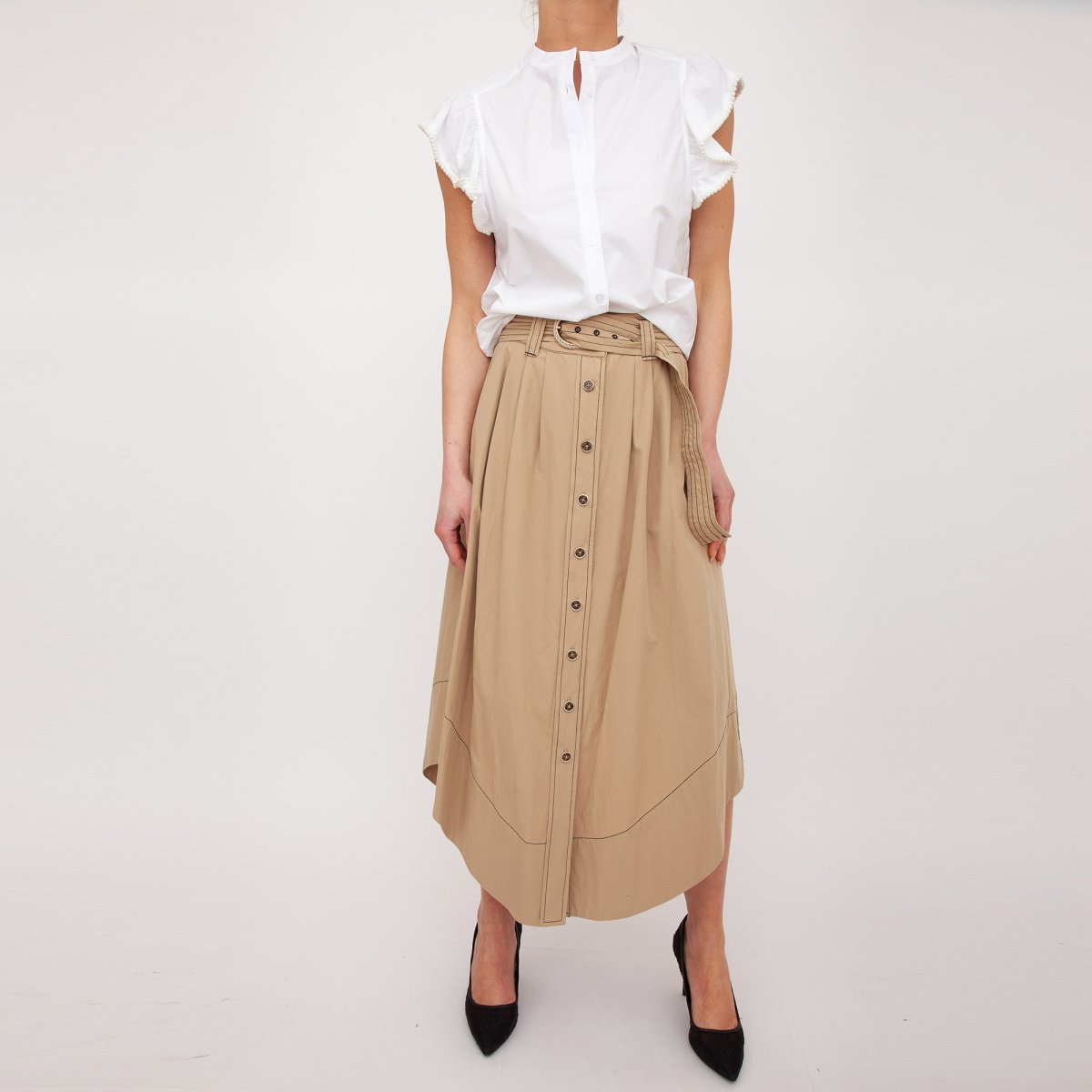 Gonna lunga in popeline di cotone leggero, a vita alta, arricciata in vita con pieghe stirate, dettagli impunturati a contrasto.