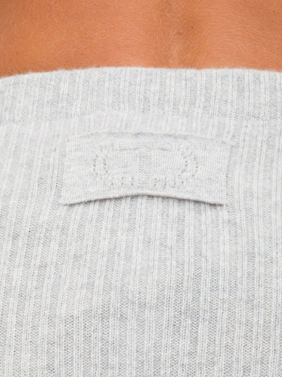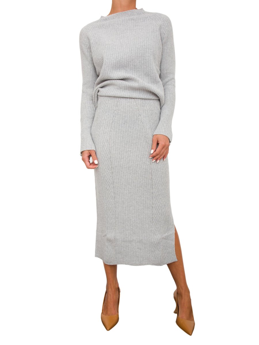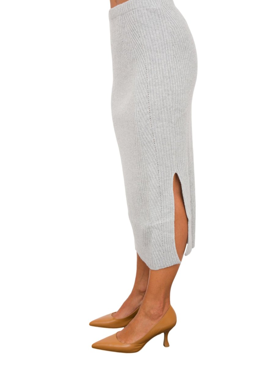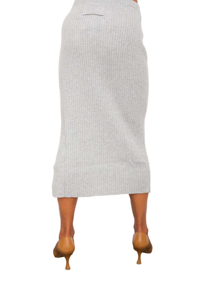Юбка-миди итальянского производства из смеси шерсти и люрекса с рельефной резинкой, подчеркивающей силуэт, эластичной талией, боковым разрезом, трикотажной этикеткой с перфорированным логотипом сзади, приталенным силуэтом.