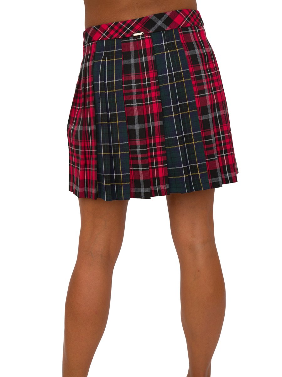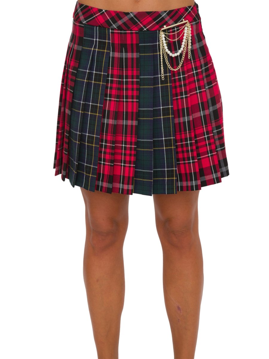 Minigonna LIU-JO plissé in misto viscosa stretch, motivo check all over, spilla gioiello sul davanti, logo in metallo sul retro e chiusura con zip sul fianco.