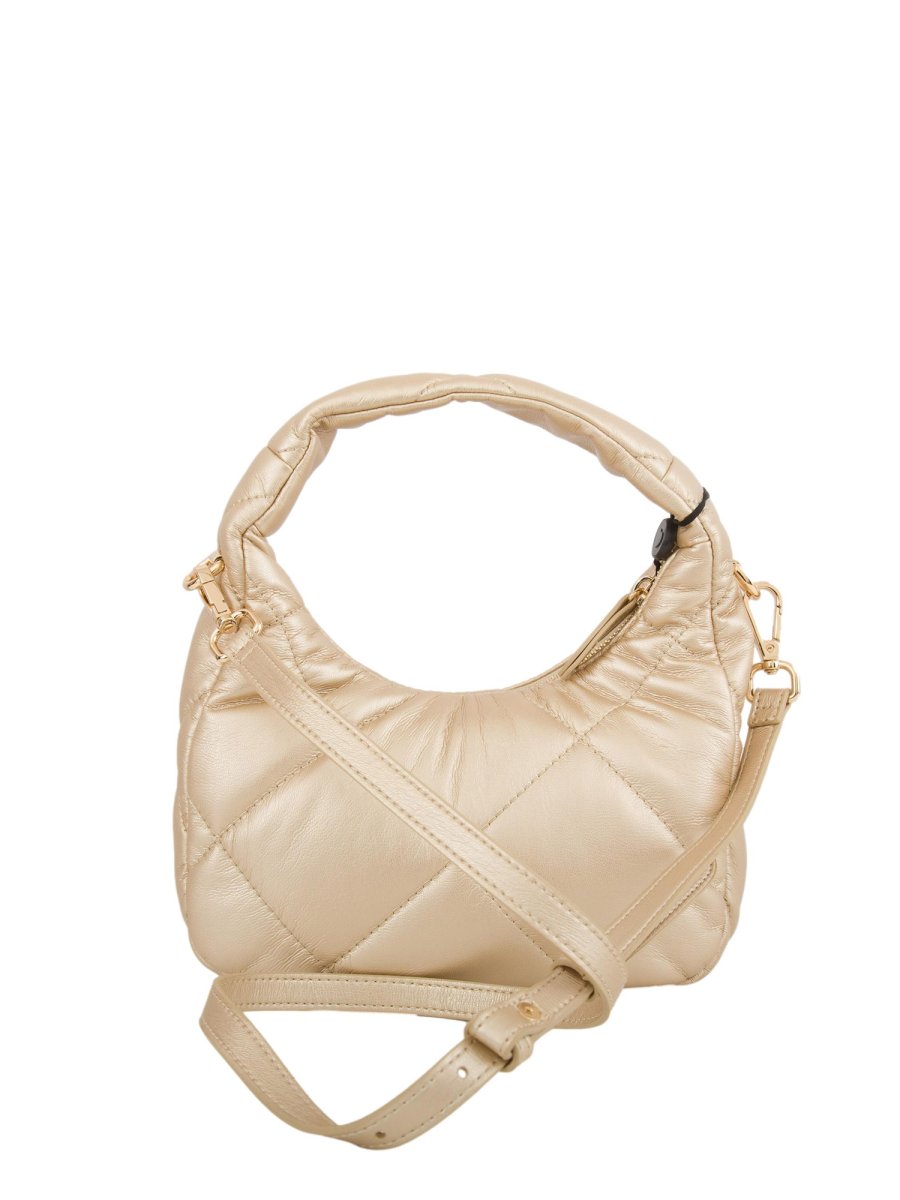 Небольшая мягкая и легкая сумка-хобо с эффектом кожи ягненка, стеганой отделкой с мягкой подкладкой, застежкой-молнией, соответствующим нарисованным логотипом в виде овальной буквы, ручкой и съемным регулируемым ремнем через плечо на подкладке. Ширина 22 см, высота 13 см, глубина 5,5 см.