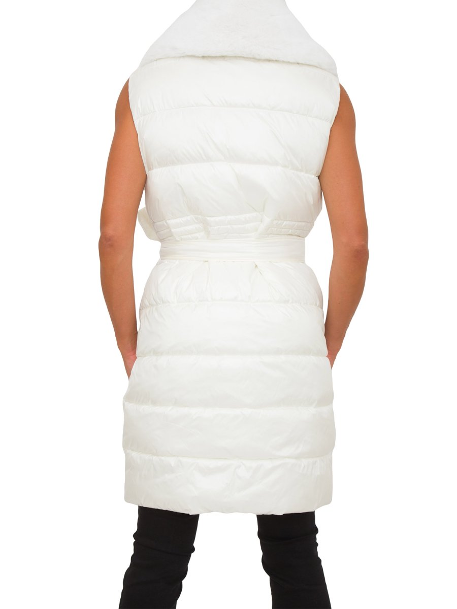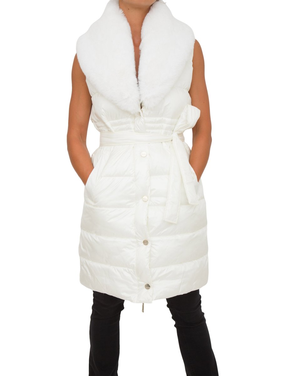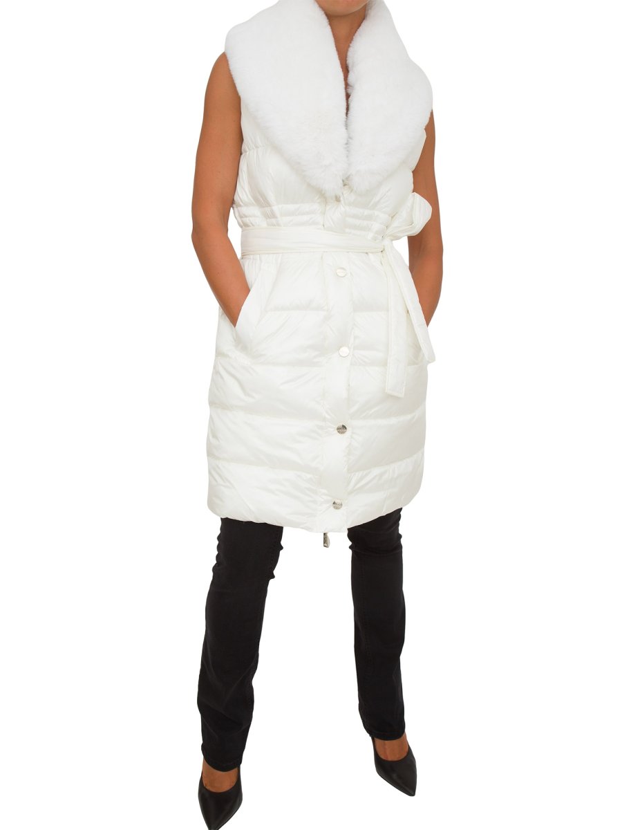 Gilet lungo da donna LIU-JO in nylon lucido, imbottitura in ovatta, trapuntatura a righe, collo a revers con pelliccia sintetica rimovibile, elastico in vita, cintura sur ton in abbinamento, tasche sui lati, logo in metallo e chiusura con bottoni a pressione.