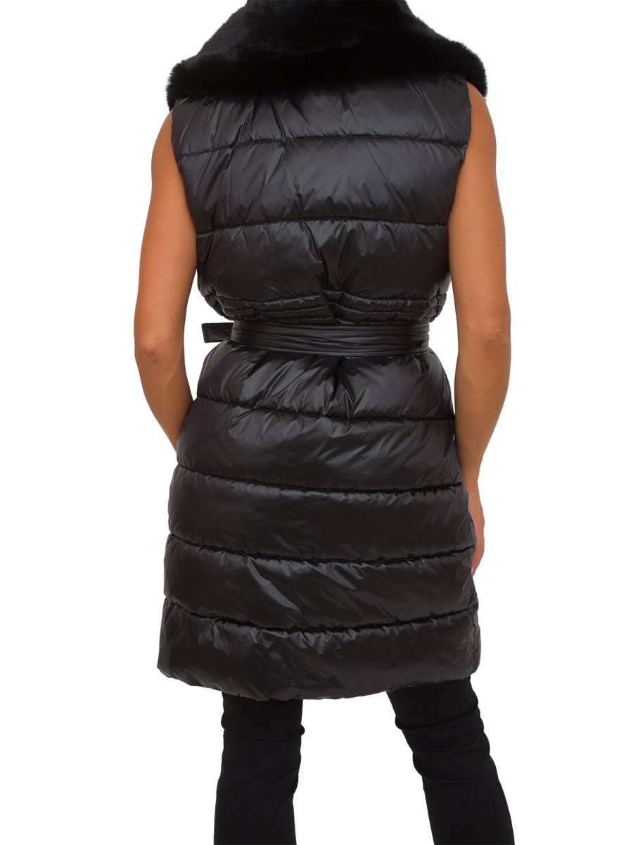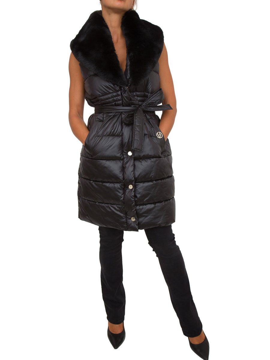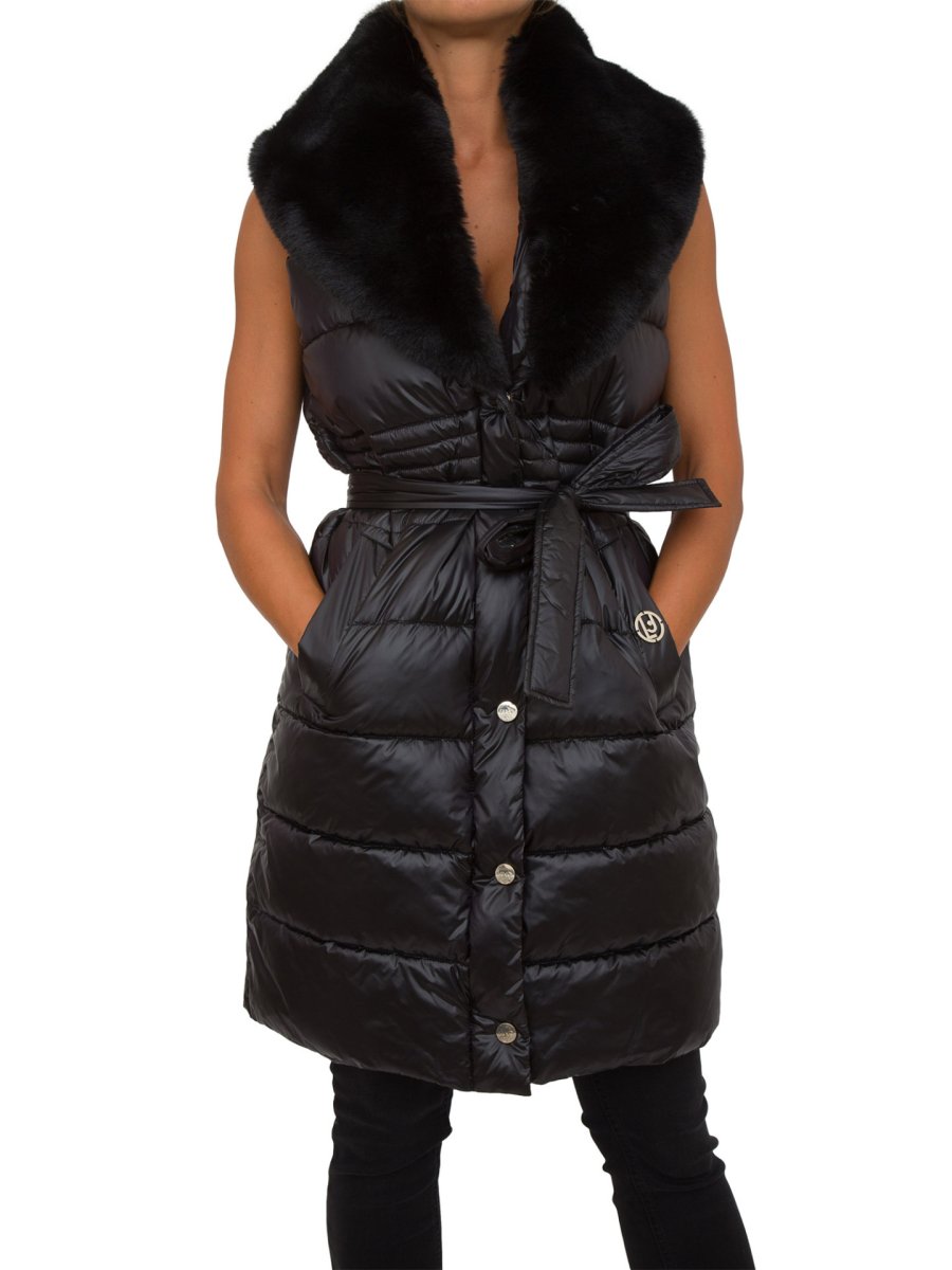 Gilet lungo da donna LIU-JO in nylon lucido, imbottitura in ovatta, trapuntatura a righe, collo a revers con pelliccia sintetica rimovibile, elastico in vita, cintura sur ton in abbinamento, tasche sui lati, logo in metallo e chiusura con bottoni a pressione.
