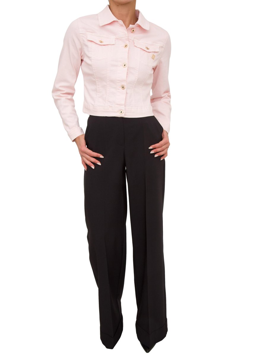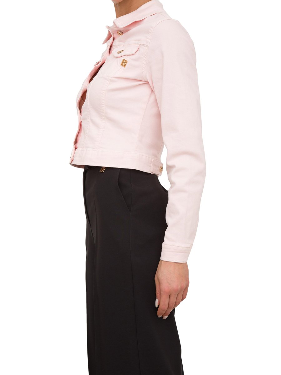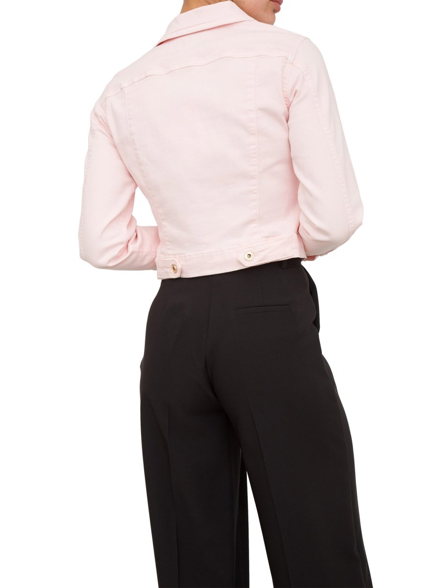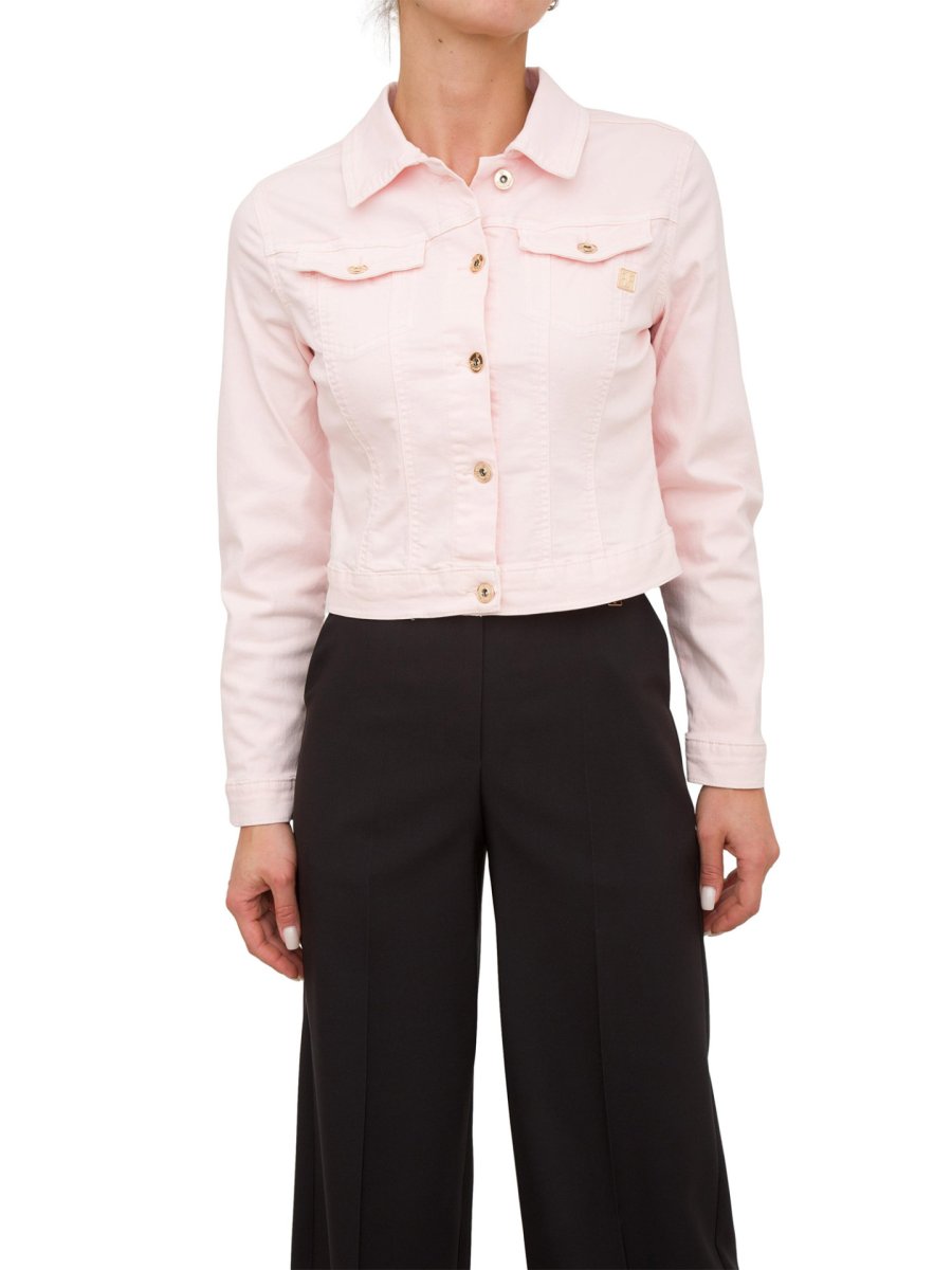 Giacca regular in denim colorato, colletto classico, taschine frontali, bottoni centrali per apertura, e con maniche lunghe.