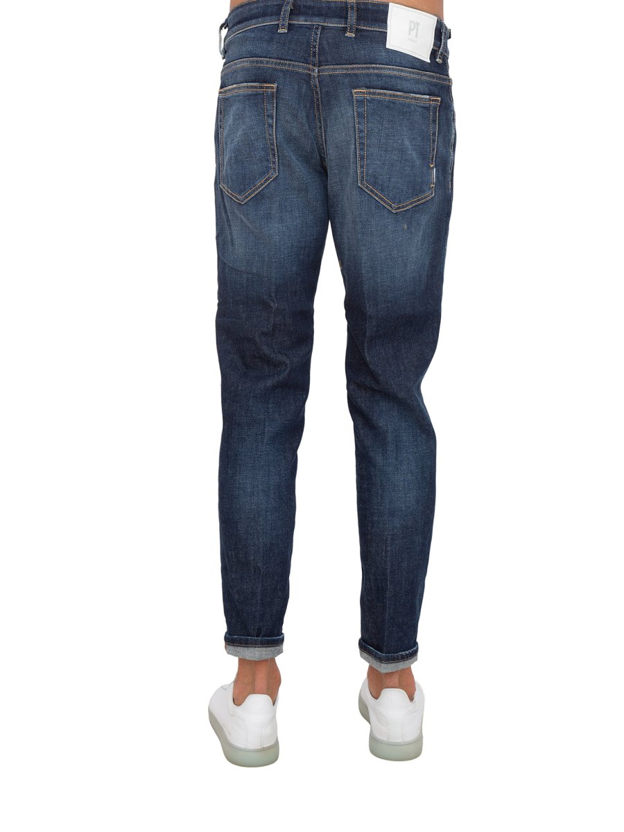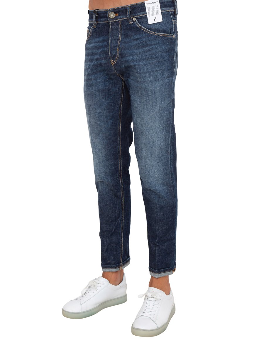 Jeans dritti a vita media, cuciture a contrasto, taglio straight, vita media, chiusura con bottone e zip nascosta, passanti e design classico a cinque tasche.
